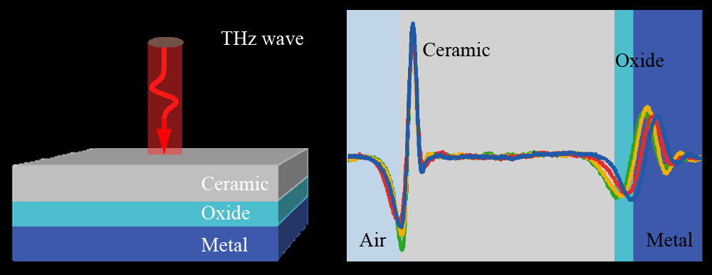 As a nondestructive testing technique, terahertz time-domain spectroscopy technology is commonly used to measure the thickness of ceramic coat in thermal barrier coatings (TBCs). However, the invisibility of ceramic/thermally grown oxide (TGO) reflective wave leads to the measurement failure of natural growth TGO whose thickness is below 10 μm in TBCs. To detect and monitor TGO in the emergence stage, a time of flight (TOF) improved TGO thickness measurement method is proposed. A simulative investigation on propagation characteristics of terahertz shows the linear relationship between TGO thickness and phase shift of feature wave. The accurate TOF increment could be acquired from wavelet soft threshold and cross-correlation function with negative effect reduction of environmental noise and system oscillation. Thus, the TGO thickness could be obtained efficiently from the TOF increment of the monitor area with different heating times. The averaged error of 1.61 μm in experimental results demonstrates the highly accurate and robust measurement of the proposed method, making it attractive for condition monitoring and life prediction of TBCs.