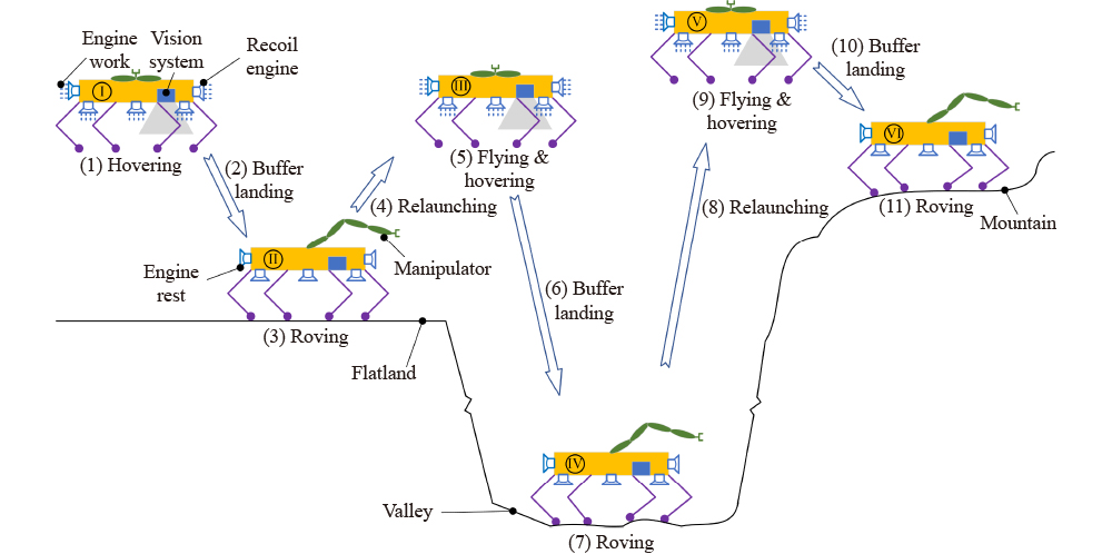 The prober with an immovable lander and a movable rover is commonly used to explore the Moon’s surface. The rover can complete the detection on relatively flat terrain of the lunar surface well, but its detection efficiency on deep craters and mountains is relatively low due to the difficulties of reaching such places. A lightweight four-legged landing and walking robot called “FLLWR” is designed in this study. It can take off and land repeatedly between any two sites wherever on deep craters, mountains or other challenging landforms that are difficult to reach by direct ground movement. The robot integrates the functions of a lander and a rover, including folding, deploying, repetitive landing, and walking. A landing control method via compliance control is proposed to solve the critical problem of impact energy dissipation to realize buffer landing. Repetitive landing experiments on a five-degree-of-freedom lunar gravity testing platform are performed. Under the landing conditions with a vertical velocity of 2.1 m/s and a loading weight of 140 kg, the torque safety margin is 10.3% and 16.7%, and the height safety margin is 36.4% and 50.1% for the cases with or without an additional horizontal disturbance velocity of 0.4 m/s, respectively. The study provides a novel insight into the next-generation lunar exploration equipment.