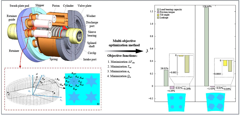 Well-designed surface textures can improve the tribological properties and the efficiency of the electro-hydrostatic actuator (EHA) pump under high-speed and high-pressure conditions. This study proposes a multi-objective optimization model to obtain the arbitrarily surface textures design of the slipper/swash plate interface for improving the mechanical and volumetric efficiency of the EHA pump. The model is composed of the lubrication film model, the component dynamic model considering the spinning motion, and the multi-objective optimization model. In this way, the arbitrary-shaped surface texture with the best comprehensive effect in the EHA pump is achieved and its positive effects in the EHA pump prototype are verified. Experimental results show a reduction in wear and an improvement in mechanical and volumetric efficiency by 1.4% and 0.8%, respectively, with the textured swash plate compared with the untextured one.