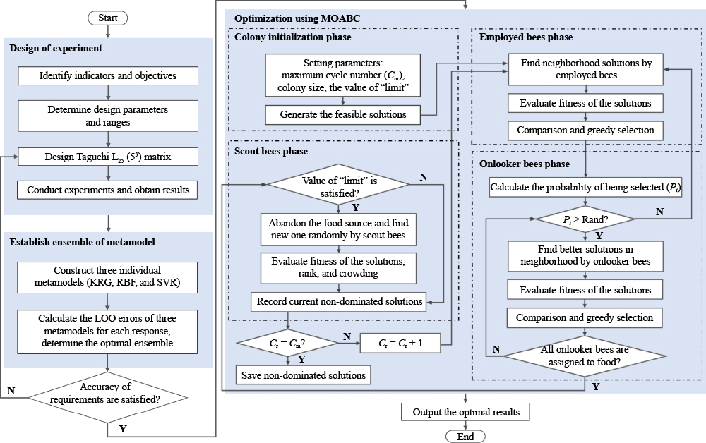 In fiber laser beam welding (LBW), the selection of optimal processing parameters is challenging and plays a key role in improving the bead geometry and welding quality. This study proposes a multi-objective optimization framework by combining an ensemble of metamodels (EMs) with the multi-objective artificial bee colony algorithm (MOABC) to identify the optimal welding parameters. An inverse proportional weighting method that considers the leave-one-out prediction error is presented to construct EM, which incorporates the competitive strengths of three metamodels. EM constructs the correlation between processing parameters (laser power, welding speed, and distance defocus) and bead geometries (bead width, depth of penetration, neck width, and neck depth) with average errors of 10.95%, 7.04%, 7.63%, and 8.62%, respectively. On the basis of EM, MOABC is employed to approximate the Pareto front, and verification experiments show that the relative errors are less than 14.67%. Furthermore, the main effect and the interaction effect of processing parameters on bead geometries are studied. Results demonstrate that the proposed EM-MOABC is effective in guiding actual fiber LBW applications.