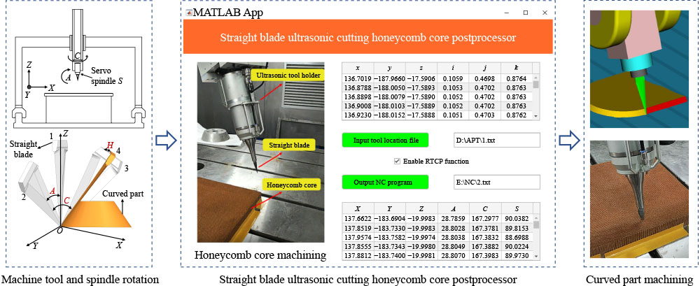 When ultrasonically cutting honeycomb core curved parts, the tool face of the straight blade must be along the curved surface’s tangent direction at all times to ensure high-quality machining of the curved surface. However, given that the straight blade is a nonstandard tool, the existing computer-aided manufacturing technology cannot directly realize the above action requirement. To solve this problem, this paper proposed an algorithm for extracting a straight blade real-time tool face vector from a 5-axis milling automatically programmed tool location file, which can realize the tool location point and tool axis vector conversion from the flat end mill to the straight blade. At the same time, for the multi-solution problem of the rotation axis, the dependent axis rotation minimization algorithm was introduced, and the spindle rotation algorithm was proposed for the tool edge orientation problem when the straight blade is used to machine the curved part. Finally, on the basis of the MATLAB platform, the dependent axis rotation minimization algorithm and spindle rotation algorithm were integrated and compiled, and the straight blade ultrasonic cutting honeycomb core postprocessor was then developed. The model of the machine tool and the definition of the straight blade were conducted in the VERICUT simulation software, and the simulation machining of the equivalent entity of the honeycomb core can then be realized. The correctness of the numerical control program generated by the postprocessor was verified by machining and accuracy testing of the two designed features. Observation and analysis of the simulation and experiment indicate that the tool pose is the same under each working condition, and the workpieces obtained by machining also meet the corresponding accuracy requirements. Therefore, the postprocessor developed in this paper can be well adapted to the honeycomb core ultrasonic cutting machine tool and realize high-quality and high-efficient machining of honeycomb core composites.