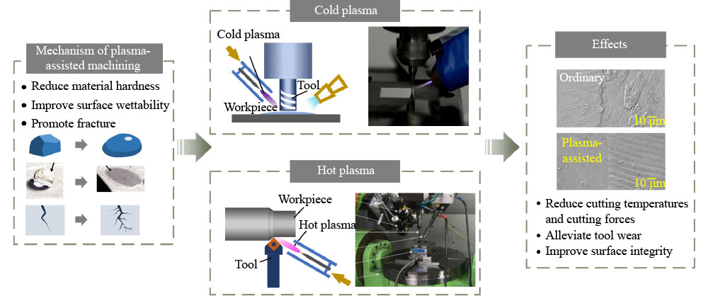 Materials with high hardness, strength or plasticity have been widely used in the fields of aviation, aerospace, and military, among others. However, the poor machinability of these materials leads to large cutting forces, high cutting temperatures, serious tool wear, and chip adhesion, which affect machining quality. Low-temperature plasma contains a variety of active particles and can effectively adjust material properties, including hardness, strength, ductility, and wettability, significantly improving material machinability. In this paper, we first discuss the mechanisms and applications of low-temperature plasma-assisted machining. After introducing the characteristics, classifications, and action mechanisms of the low-temperature plasma, we describe the effects of the low-temperature plasma on different machining processes of various difficult-to-cut materials. The low-temperature plasma can be classified as hot plasma and cold plasma according to the different equilibrium states. Hot plasma improves material machinability via the thermal softening effect induced by the high temperature, whereas the main mechanisms of the cold plasma can be summarized as chemical reactions to reduce material hardness, the hydrophilization effect to improve surface wettability, and the Rehbinder effect to promote fracture. In addition, hybrid machining methods combining the merits of the low-temperature plasma and other energy fields like ultrasonic vibration, liquid nitrogen, and minimum quantity lubrication are also described and analyzed. Finally, the promising development trends of low-temperature plasma-assisted machining are presented, which include more precise control of the heat-affected zone in hot plasma-assisted machining, cold plasma-assisted polishing of metal materials, and further investigations on the reaction mechanisms between the cold plasma and other materials.