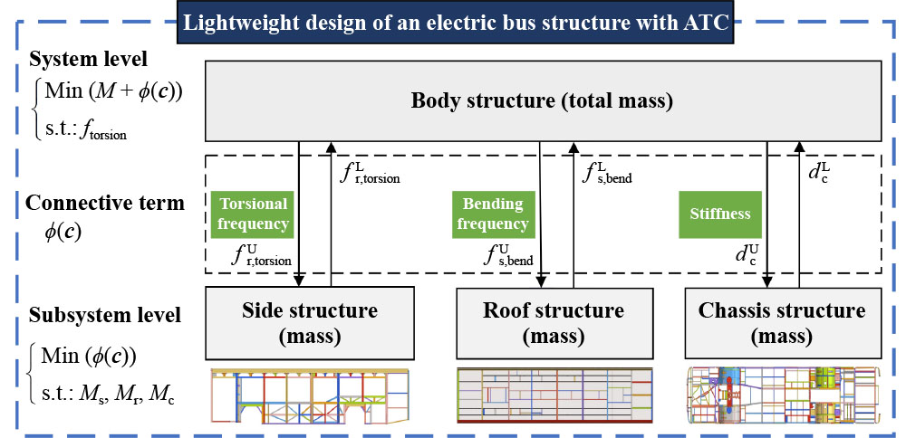 Lightweight designs of new-energy vehicles can reduce energy consumption, thereby improving driving mileage. In this study, a lightweight design of a newly developed multi-material electric bus body structure is examined in combination with analytical target cascading (ATC). By proposing an ATC-based two-level optimization strategy, the original lightweight design problem is decomposed into the system level and three subsystem levels. The system-level optimization model is related to mass minimization with all the structural modal frequency constraints, while each subsystem-level optimization model is related to the sub-structural performance objective with sub-structure mass constraints. To enhance the interaction between two-level systems, each subsystem-level objective is reformulated as a penalty-based function coordinated with the system-level objective. To guarantee the accuracy of the model-based analysis, a finite element model is validated through experimental modal test. A sequential quadratic programming algorithm is used to address the defined optimization problem for effective convergence. Compared with the initial design, the total mass is reduced by 49 kg, and the torsional stiffness is increased by 17.5%. In addition, the obtained design is also validated through strength analysis.