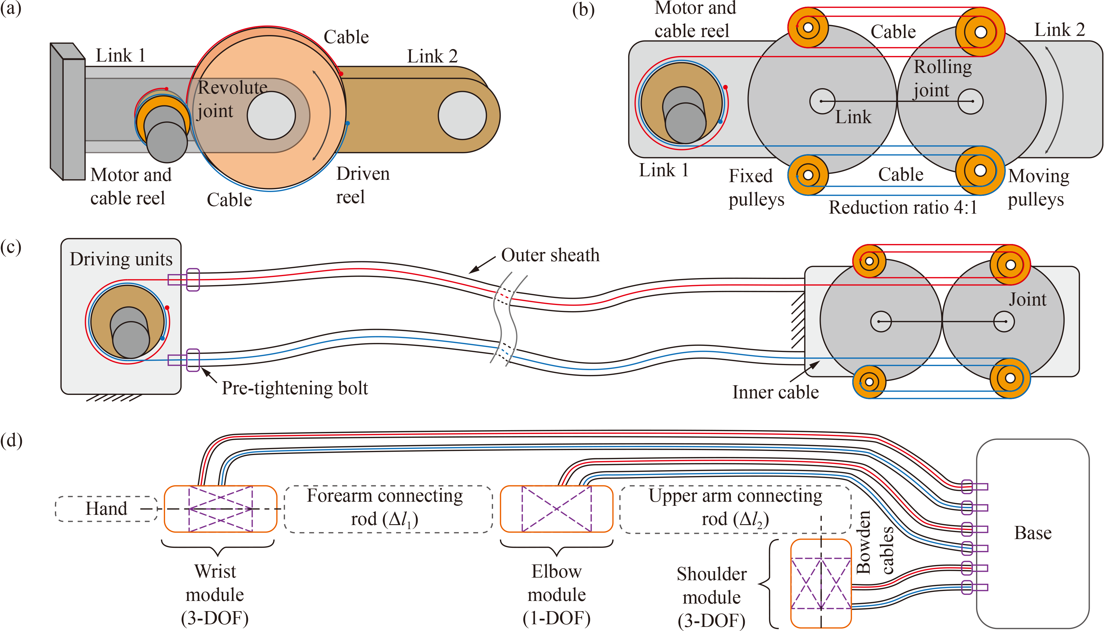 This paper proposes a novel modular cable-driven humanoid arm with anti-parallelogram mechanisms (APMs) and Bowden cables. The lightweight arm realizes the advantage of joint independence and the rational layout of the driving units on the base. First, this paper analyzes the kinematic performance of the APM and uses the rolling motion between two ellipses to approximate a pure-circular-rolling motion. Then, a novel type of one-degree-of-freedom (1-DOF) elbow joint is proposed based on this principle, which is also applied to design the 3-DOF wrist and shoulder joints. Next, Bowden cables are used to connect the joints and their driving units to obtain a modular cable-driven arm with excellent joint independence. After that, both the forward and inverse kinematics of the entire arm are analyzed. Last, a humanoid arm prototype was developed, and the assembly velocity, joint motion performance, joint stiffness, load carrying, typical humanoid arm movements, and repeatability were tested to verify the arm performance.