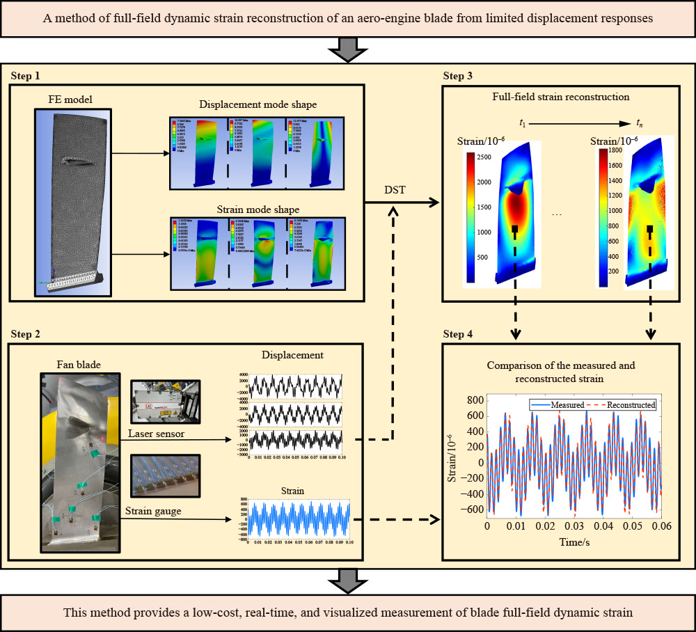 Blade strain distribution and its change with time are crucial for reliability analysis and residual life evaluation in blade vibration tests. Traditional strain measurements are achieved by strain gauges (SGs) in a contact manner at discrete positions on the blades. This study proposes a method of full-field and real-time strain reconstruction of an aero-engine blade based on limited displacement responses. Limited optical measured displacement responses are utilized to reconstruct the full-field strain. The full-field strain distribution is in-time visualized. A displacement-to-strain transformation matrix is derived on the basis of the blade mode shapes in the modal coordinate. The proposed method is validated on an aero-engine blade in numerical and experimental cases. Three discrete vibrational displacement responses measured by laser triangulation sensors are used to reconstruct the full-field strain over the whole operating time. The reconstructed strain responses are compared with the results measured by SGs and numerical simulation. The high consistency between the reconstructed and measured results demonstrates the accurate strain reconstructed by the method. This paper provides a low-cost, real-time, and visualized measurement of blade full-field dynamic strain using displacement response, where the traditional SGs would fail.