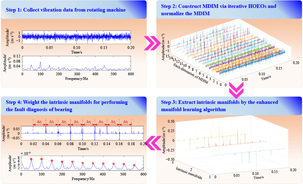 As parameter independent yet simple techniques, the energy operator (EO) and its variants have received considerable attention in the field of bearing fault feature detection. However, the performances of these improved EO techniques are subjected to the limited number of EOs, and they cannot reflect the non-linearity of the machinery dynamic systems and affect the noise reduction. As a result, the fault-related transients strengthened by these improved EO techniques are still subject to contamination of strong noises. To address these issues, this paper presents a novel EO fusion strategy for enhancing the bearing fault feature nonlinearly and effectively. Specifically, the proposed strategy is conducted through the following three steps. First, a multi-dimensional information matrix (MDIM) is constructed by performing the higher order energy operator (HOEO) on the analysis signal iteratively. MDIM is regarded as the fusion source of the proposed strategy with the properties of improving the signal-to-interference ratio and suppressing the noise in the low-frequency region. Second, an enhanced manifold learning algorithm is performed on the normalized MDIM to extract the intrinsic manifolds correlated with the fault-related impulses. Third, the intrinsic manifolds are weighted to recover the fault-related transients. Simulation studies and experimental verifications confirm that the proposed strategy is more effective for enhancing the bearing fault feature than the existing methods, including HOEOs, the weighting HOEO fusion, the fast Kurtogram, and the empirical mode decomposition.