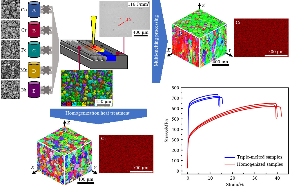 High-entropy alloys (HEAs) are considered alternatives to traditional structural materials because of their superior mechanical, physical, and chemical properties. However, alloy composition combinations are too numerous to explore. Finding a rapid synthesis method to accelerate the development of HEA bulks is imperative. Existing in situ synthesis methods based on additive manufacturing are insufficient for efficiently controlling the uniformity and accuracy of components. In this work, laser powder bed fusion (L-PBF) is adopted for the in situ synthesis of equiatomic CoCrFeMnNi HEA from elemental powder mixtures. High composition accuracy is achieved in parallel with ensuring internal density. The L-PBF-based process parameters are optimized; and two different methods, namely, a multi-melting process and homogenization heat treatment, are adopted to address the problem of incompletely melted Cr particles in the single-melted samples. X-ray diffraction indicates that HEA microstructure can be obtained from elemental powders via L-PBF. In the triple-melted samples, a strong crystallographic texture can be observed through electron backscatter diffraction, with a maximum polar density of 9.92 and a high ultimate tensile strength (UTS) of (735.3 ± 14.1) MPa. The homogenization heat-treated samples appear more like coarse equiaxed grains, with a UTS of (650.8 ± 16.1) MPa and an elongation of (40.2% ± 1.3%). Cellular substructures are also observed in the triple-melted samples, but not in the homogenization heat-treated samples. The differences in mechanical properties primarily originate from the changes in strengthening mechanism. The even and flat fractographic morphologies of the homogenization heat-treated samples represent a more uniform internal microstructure that is different from the complex morphologies of the triple-melted samples. Relative to the multi-melted samples, the homogenization heat-treated samples exhibit better processability, with a smaller composition deviation, i.e., ≤ 0.32 at.%. The two methods presented in this study are expected to have considerable potential for developing HEAs with high composition accuracy and composition flexibility.