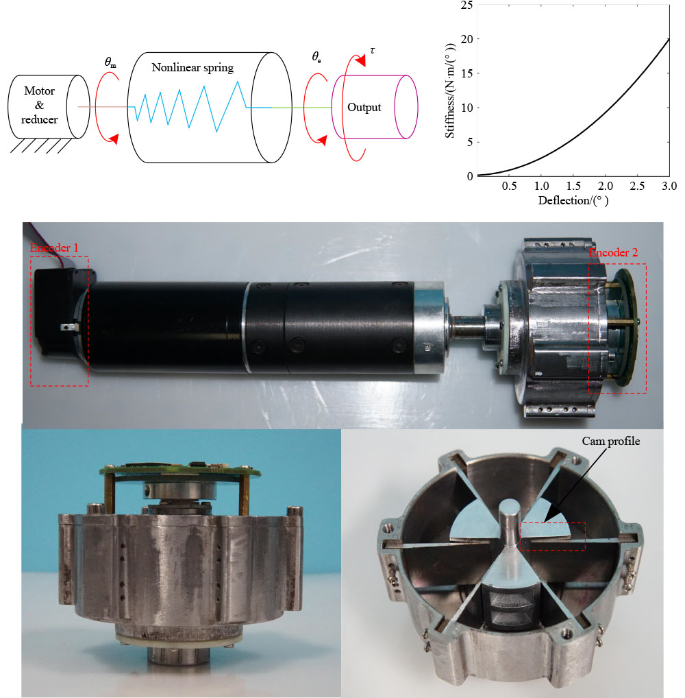 A nonlinear stiffness actuator (NSA) could achieve high torque/force resolution in low stiffness range and high bandwidth in high stiffness range, both of which are beneficial for physical interaction between a robot and the environment. Currently, most of NSAs are complex and hardly used for engineering. In this paper, oriented to engineering applications, a new simple NSA was proposed, mainly including leaf springs and especially designed cams, which could perform a predefined relationship between torque and deflection. The new NSA has a compact structure, and it is lightweight, both of which are also beneficial for its practical application. An analytical methodology that maps the predefined relationship between torque and deflection to the profile of the cam was developed. The optimal parameters of the structure were given by analyzing the weight of the NSA and the mechanic characteristic of the leaf spring. Though sliding friction force is inevitable because no rollers were used in the cam-based mechanism, the sliding displacement between the cam and the leaf spring is very small, and consumption of sliding friction force is very low. Simulations of different torque‒deflection profiles were carried out to verify the accuracy and applicability of performing predefined torque‒deflection profiles. Three kinds of prototype experiments, including verification experiment of the predefined torque‒deflection profile, torque tracking experiment, and position tracking experiment under different loads, were conducted. The results prove the accuracy of performing the predefined torque‒deflection profile, the tracking performance, and the interactive performance of the new NSA.