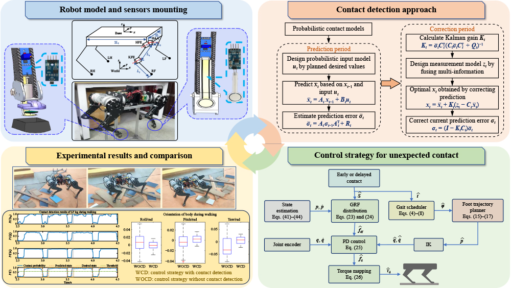 Reliable foot-to-ground contact state detection is crucial for the locomotion control of quadruped robots in unstructured environments. To improve the reliability and accuracy of contact detection for quadruped robots, a detection approach based on the probabilistic contact model with multi-information fusion is presented to detect the actual contact states of robotic feet with the ground. Moreover, a relevant control strategy to address unexpected early and delayed contacts is planned. The approach combines the internal state information of the robot with the measurements from external sensors mounted on the legs and feet of the prototype. The overall contact states are obtained by the classification of the model-based predicted probabilities. The control strategy for unexpected foot-to-ground contacts can correct the control actions of each leg of the robot to traverse cluttered environments by changing the contact state. The probabilistic model parameters are determined by testing on the single-leg experimental platform. The experiments are conducted on the experimental prototype, and results validate the contact detection and control strategy for unexpected contacts in unstructured terrains during walking and trotting. Compared with the body orientation under the time-based control method regardless of terrain, the root mean square errors of roll, pitch, and yaw respectively decreased by 60.07%, 54.73%, and 64.50% during walking and 73.40%, 61.49%, and 61.48% during trotting.