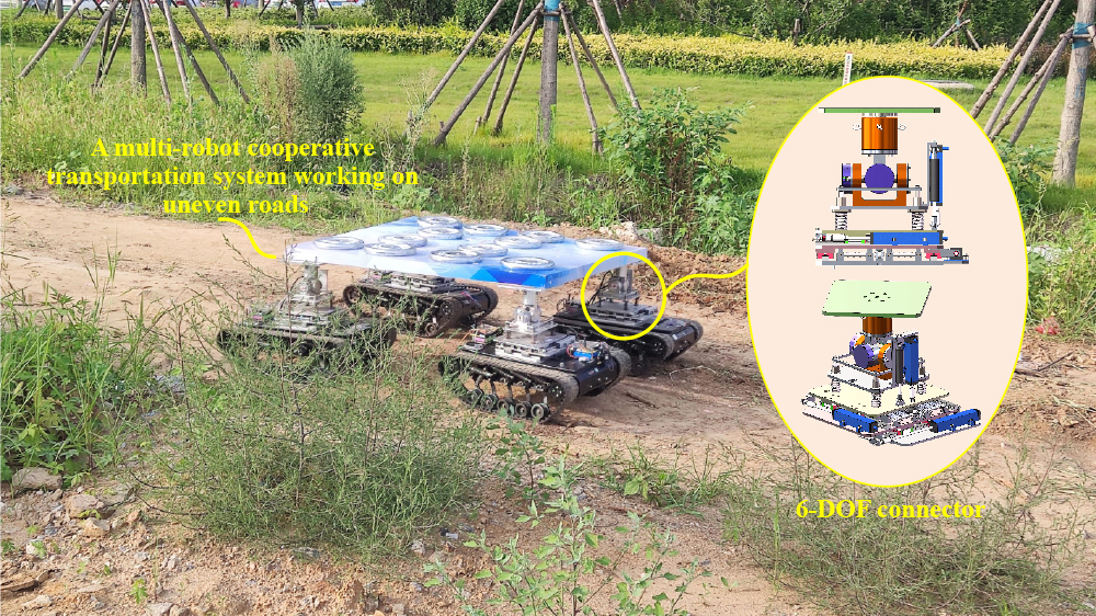 Given limited terrain adaptability, most existing multirobot cooperative transportation systems (MRCTSs) mainly work on flat pavements, restricting their outdoor applications. The connectors’ finite deformation capability and the control strategies’ limitations are primarily responsible for this phenomenon. This study proposes a novel MRCTS based on tracked mobile robots (TMRs) to improve terrain adaptability and expand the application scenarios of MRCTSs. In structure design, we develop a novel 6-degree-of-freedom passive adaptive connector to link multiple TMRs and the transported object (the communal payload). In addition, the connector is set with sensors to measure the position and orientation of the robot with respect to the object for feedback control. In the control strategy, we present a virtual leader–physical follower collaborative paradigm. The leader robot is imaginary to describe the movement of the entire system and manage the follower robots. All the TMRs in the system act as follower robots to transport the object cooperatively. Having divided the whole control structure into the leader robot level and the follower robot level, we convert the motion control of the two kinds of robots to trajectory tracking control problems and propose a novel double closed-loop kinematics control framework. Furthermore, a control law satisfying saturation constraints is derived to ensure transportation stability. An adaptive control algorithm processes the wheelbase uncertainty of the TMR. Finally, we develop a prototype of the TMR-based MRCTS for experiments. In the trajectory tracking experiment, the developed MRCTS with the proposed control scheme can converge to the reference trajectory in the presence of initial tracking errors in a finite time. In the outdoor experiment, the proposed MRCTS consisting of four TMRs can successfully transport a payload weighing 60 kg on an uneven road with the single TMR’s maximum load limited to 15 kg. The experimental results demonstrate the effectiveness of the structural design and control strategies of the TMR-based MRCTS.
