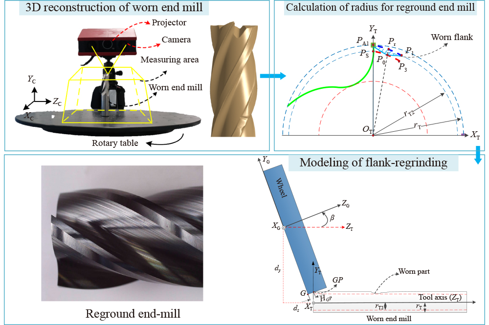 Flanks of end mills are prone to wear in a long machining process. Regrinding is widely used in workshops to restore the flank to an original-like state. However, the traditional method involves material waste by trial and error and dramatically decreases the potential regrinding. Moreover, over-cut would happen to the flutes of worn cutters in the regrinding processes because of improper wheel path. This study presented a new approach to planning the wheel path for regrinding worn end mills to minimize material loss and recover the over-cut. In planning, a scaling method was developed to determine the maximum size of the new cutter according to the similarity of cutter shapes before and after regrinding. Then, the wheel path is first generated by envelope theory to regrind the worn area with a four-axis computer numerical control grinder according to the new size of cutters. Moreover, a second regrinding strategy is applied to recover the flute shape over-cut in the first grinding. Finally, the proposed method is verified by an experiment. Results showed that the proposed approach could save 25% of cutter material compared with the traditional method and ensure at least three regrinding times. This work effectively provides a general regrinding solution for the worn flank with maximum material-saving and regrinding period.