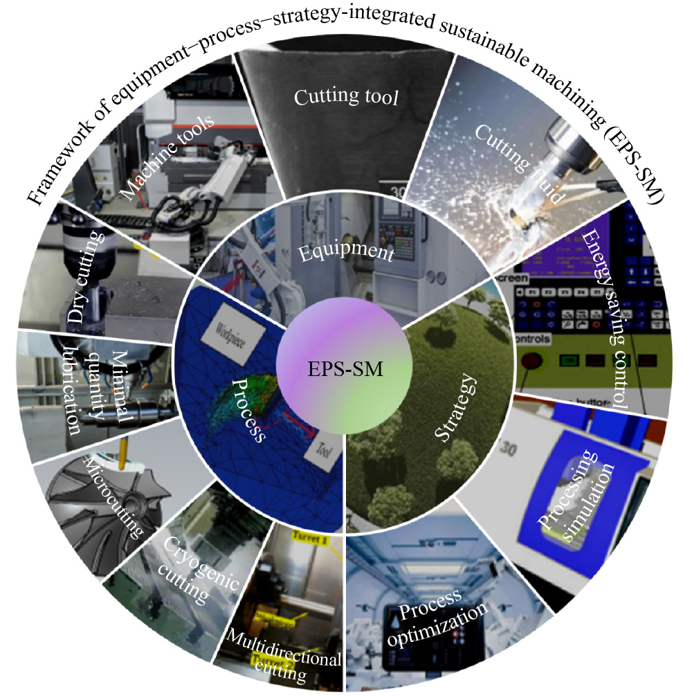 Although the manufacturing industry has improved the quality of processing, optimization and upgrading must be performed to meet the requirements of global sustainable development. Sustainable production is considered to be a favorable strategy for achieving machining upgrades characterized by high quality, high efficiency, energy savings, and emission reduction. Sustainable production has aroused widespread interest, but only a few scholars have studied the sustainability of machining from multiple dimensions. The sustainability of machining must be investigated multidimensionally and accurately. Thus, this study explores the sustainability of machining from the aspects of equipment, process, and strategy. In particular, the equipment, process, and strategy of sustainable machining are systematically analyzed and integrated into a research framework. Then, this study analyzes sustainable machining-oriented machining equipment from the aspects of machine tools, cutting tools, and materials such as cutting fluid. Machining processes are explored as important links of sustainable machining from the aspects of dry cutting, microlubrication, microcutting, low-temperature cutting, and multidirectional cutting. The strategies for sustainable machining are also analyzed from the aspects of energy-saving control, machining simulation, and process optimization of machine tools. Finally, opportunities and challenges, including policies and regulations toward sustainable machining, are discussed. This study is expected to offer prospects for sustainable machining development and strategies for implementing sustainable machining.