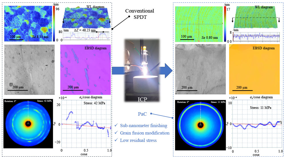 Polycrystalline tin is an ideal excitation material for extreme ultraviolet light sources. However, the existence of grain boundary (GB) limits the surface roughness of polycrystalline tin after single-point diamond turning (SPDT). In this work, a novel method termed inductively coupled plasma (ICP)-assisted cutting was developed for the sub-nanometer finishing of polycrystalline tin. The relationship between ICP power, processing time, and modification depth was established by thermodynamic simulation, and the fitted heat transfer coefficient of polycrystalline tin was 540 W/(m2·K). The effects of large-thermal-gradient ICP treatment on the microstructure of polycrystalline tin were studied. After 0.9 kW ICP processing for 3.0 s, corresponding to the temperature gradient of 0.30 K/µm, the grain size of polycrystalline tin was expanded from a size of approximately 20–80 μm to a millimeter scale. The Taguchi method was used to investigate the effects of rotational speed, depth of cut, and feed rate on SPDT. Experiments conducted based on the ICP system indicated that the plasma-assisted cutting method promoted the reduction of the influence of GB steps on the finishing of polycrystalline tin, thereby achieving a surface finish from 8.53 to 0.80 nm in Sa. The results of residual stress release demonstrated that the residual stress of plasma-assisted turning processing after 504 h stress release was 10.7 MPa, while that of the turning process without the ICP treatment was 41.6 MPa.