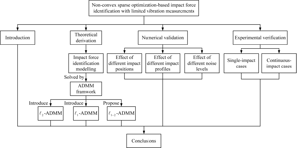Impact force identification is important for structure health monitoring especially in applications involving composite structures. Different from the traditional direct measurement method, the impact force identification technique is more cost effective and feasible because it only requires a few sensors to capture the system response and infer the information about the applied forces. This technique enables the acquisition of impact locations and time histories of forces, aiding in the rapid assessment of potentially damaged areas and the extent of the damage. As a typical inverse problem, impact force reconstruction and localization is a challenging task, which has led to the development of numerous methods aimed at obtaining stable solutions. The classical regularization method often struggles to generate sparse solutions. When solving the under-determined problem, regularization often identifies false forces in non-loaded regions, interfering with the accurate identification of the true impact locations. The popular sparse regularization, while promoting sparsity, underestimates the amplitude of impact forces, resulting in biased estimations. To alleviate such limitations, a novel non-convex sparse regularization method that uses the non-convex penalty, which is the difference of the and norms, as a regularizer, is proposed in this paper. The principle of alternating direction method of multipliers (ADMM) is introduced to tackle the non-convex model by facilitating the decomposition of the complex original problem into easily solvable subproblems. The proposed method named is applied to solve the impact force identification problem with unknown force locations, which can realize simultaneous impact localization and time history reconstruction with an under-determined, sparse sensor configuration. Simulations and experiments are performed on a composite plate to verify the identification accuracy and robustness with respect to the noise of the method. Results indicate that compared with other existing regularization methods, the method can simultaneously reconstruct and localize impact forces more accurately, facilitating sparser solutions, and yielding more accurate results.