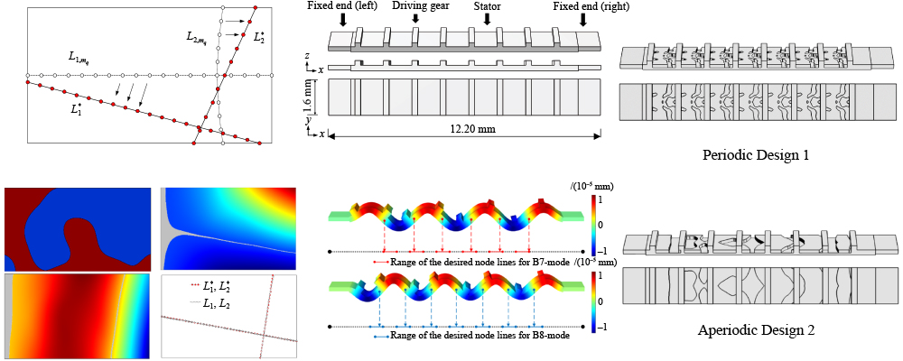 Accurately controlling the nodal lines of vibrating structures with topology optimization is a highly challenging task. The major difficulties in this type of problem include a large number of design variables, the highly nonlinear and multi-peak characteristics of iteration, and the changeable orders of eigenmodes. In this study, an effective material-field series-expansion (MFSE)-based topology optimization design strategy for precisely controlling nodal lines is proposed. Here, two typical optimization targets are established: (1) minimizing the difference between structural nodal lines and their desired positions, and (2) keeping the position of nodal lines within the specified range while optimizing certain dynamic performance. To solve this complex optimization problem, the structural topology of structures is first represented by a few design variables on the basis of the MFSE model. Then, the problems are effectively solved using a sequence Kriging-based optimization algorithm without requiring design sensitivity analysis. The proposed design strategy inherently circumvents various numerical difficulties and can effectively obtain the desired vibration modes and nodal lines. Numerical examples are provided to validate the proposed topology optimization models and the corresponding solution strategy.