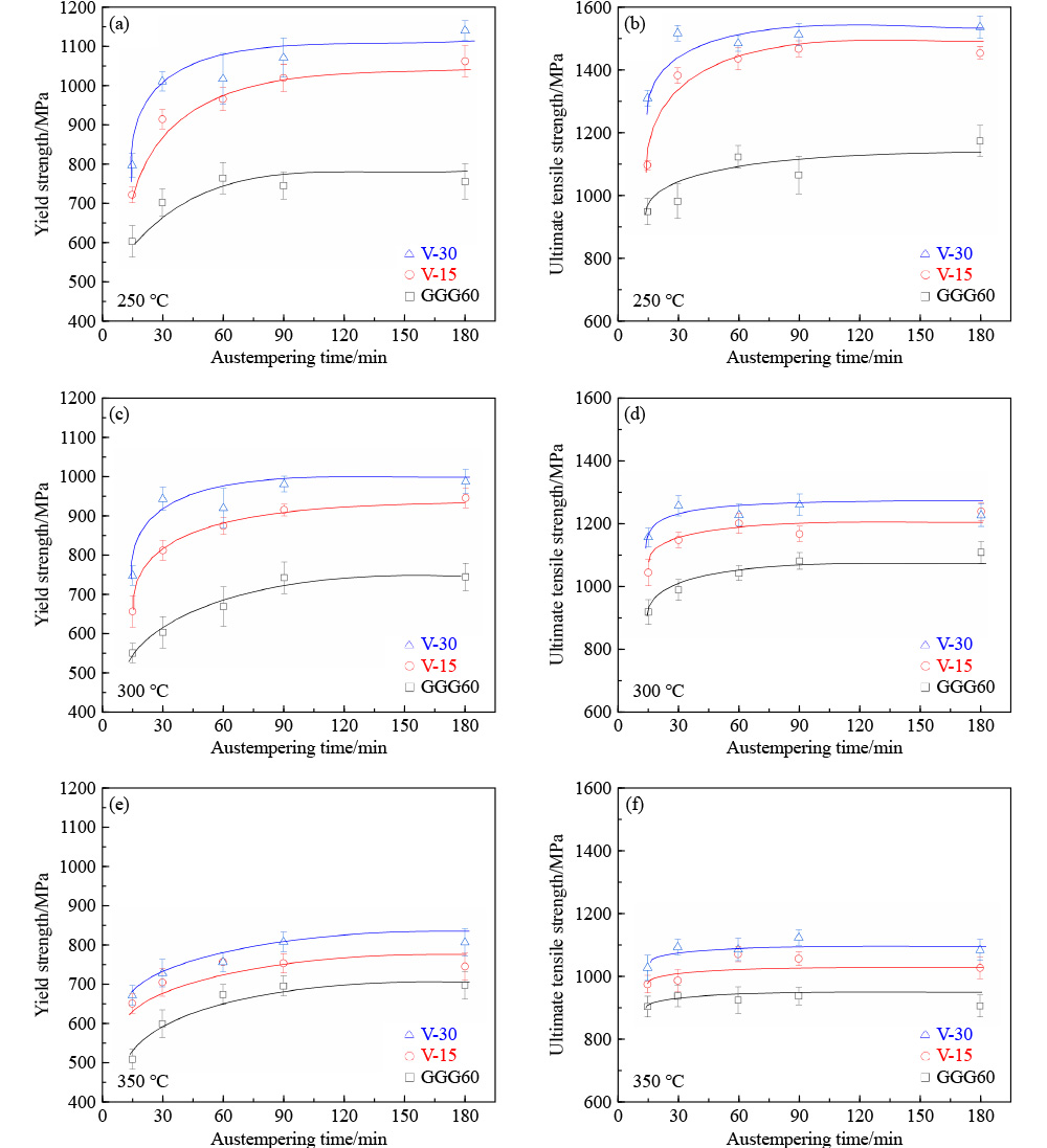 This study focused on the development of austempered ductile iron (ADI) with desirable combination of mechanical properties for crankshaft applications by the combined effect of vanadium (V) alloying and an optimized heat treatment process. The produced unalloyed GGG60, 0.15% V-alloyed GGG60 (V-15), and 0.30% V-alloyed GGG60 samples were subjected to austenitizing at 900 °C for 1 h and subsequent austempering processes at 250, 300, and 350 °C for 15, 30, 60, 90, and 180 min. As a result of these austempering processes, different bainitic structures were obtained, which led to the formation of diverse combinations of mechanical properties. The mechanical properties of the austempered samples were tested comprehensively, and the results were correlated with their microstructures and the stability of the retained austenite phases. From the microstructural observations, the V-alloyed samples exhibited a finer microstructure and a more acicular ferrite phase than unalloyed samples. The V addition delayed the coarsening of the acicular ferrite structures and considerably contributed to the improvement of the mechanical properties of GGG60. Moreover, the X-ray diffraction results revealed that the retained austenite volume and the carbon enrichment of austenite phases in ADI samples were remarkably affected by the addition of vanadium. The increase in volume fraction of retained austenite and its carbon content provided favorable ductility and toughness to V-15, as confirmed by the elongation and impact test results. Consequently, the dual-phase ausferrite microstructure of V-15 that was austempered at 300 °C for 60 min exhibited high strength with substantial ductility and toughness for crankshaft applications.