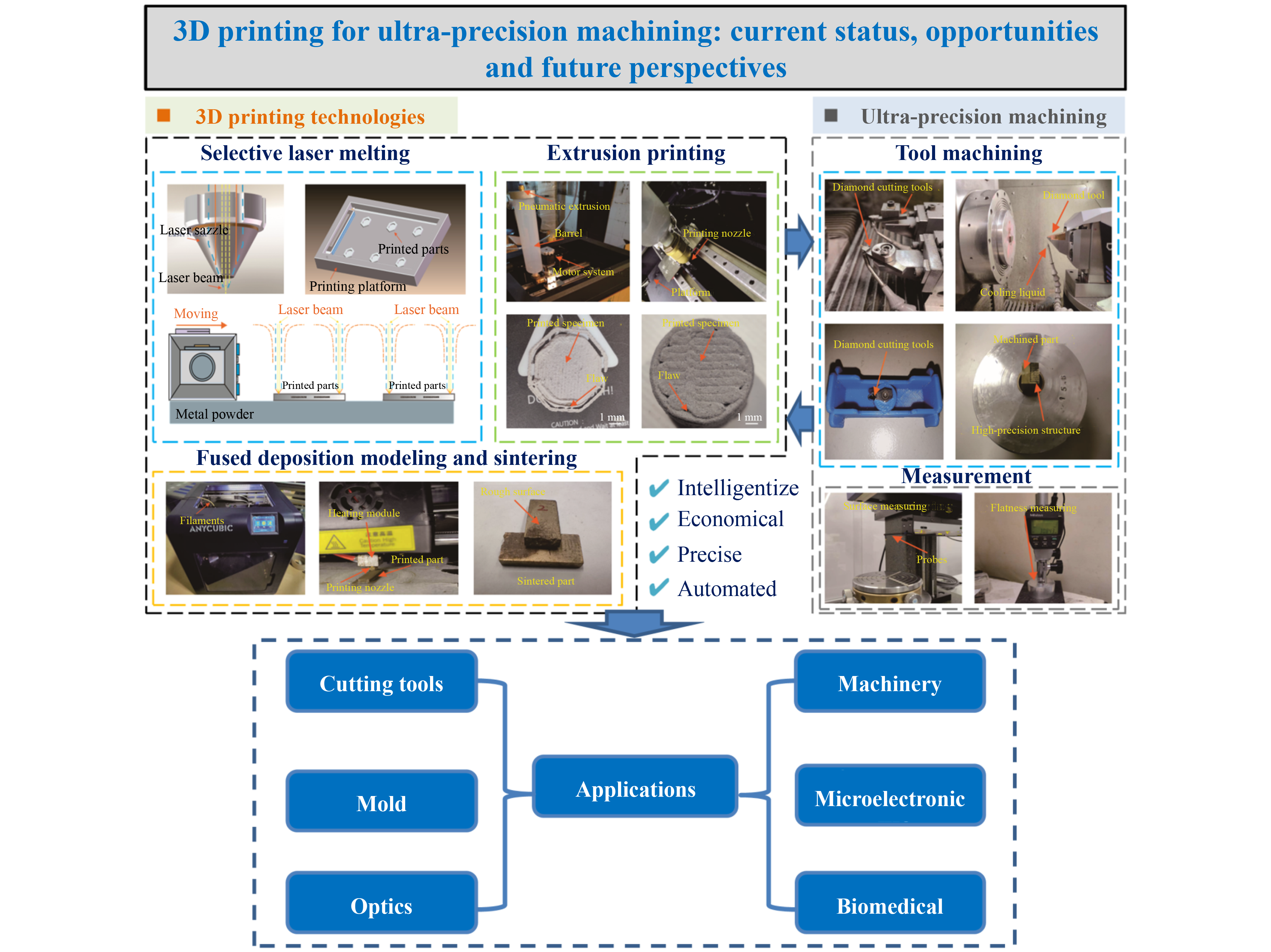 Additive manufacturing, particularly 3D printing, has revolutionized the manufacturing industry by allowing the production of complex and intricate parts at a lower cost and with greater efficiency. However, 3D-printed parts frequently require post-processing or integration with other machining technologies to achieve the desired surface finish, accuracy, and mechanical properties. Ultra-precision machining (UPM) is a potential machining technology that addresses these challenges by enabling high surface quality, accuracy, and repeatability in 3D-printed components. This study provides an overview of the current state of UPM for 3D printing, including the current UPM and 3D printing stages, and the application of UPM to 3D printing. Following the presentation of current stage perspectives, this study presents a detailed discussion of the benefits of combining UPM with 3D printing and the opportunities for leveraging UPM on 3D printing or supporting each other. In particular, future opportunities focus on cutting tools manufactured via 3D printing for UPM, UPM of 3D-printed components for real-world applications, and post-machining of 3D-printed components. Finally, future prospects for integrating the two advanced manufacturing technologies into potential industries are discussed. This study concludes that UPM is a promising technology for 3D-printed components, exhibiting the potential to improve the functionality and performance of 3D-printed products in various applications. It also discusses how UPM and 3D printing can complement each other.