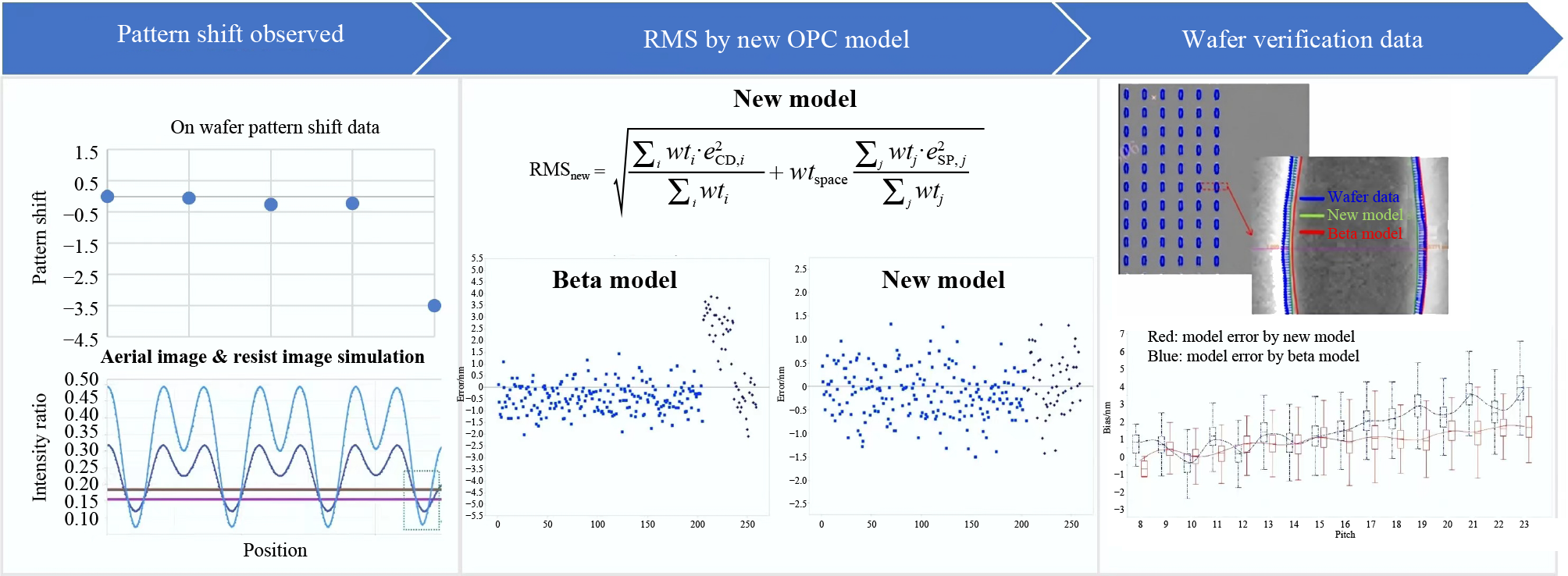 With the continued shrinking of the critical dimensions (CDs) of wafer patterning, the requirements for modeling precision in optical proximity correction (OPC) increase accordingly. This requirement extends beyond CD controlling accuracy to include pattern alignment accuracy because misalignment can lead to considerable overlay and metal-via coverage issues at advanced nodes, affecting process window and yield. This paper proposes an efficient OPC modeling approach that prioritizes pattern-shift-related elements to tackle the issue accurately. Our method integrates careful measurement selection, the implementation of pattern-shift-aware structures in design, and the manipulation of the cost function during model tuning to establish a robust model. Confirmatory experiments are performed on a via layer fabricated using a negative tone development. Results demonstrate that pattern shifts can be constrained within a range of ±1 nm, remarkably better than the original range of ±3 nm. Furthermore, simulations reveal notable differences between post OPC and original masks when considering pattern shifts at locations sensitive to this phenomenon. Experimental validation confirms the accuracy of the proposed modeling approach, and a firm consistency is observed between the simulation results and experimental data obtained from actual design structures.