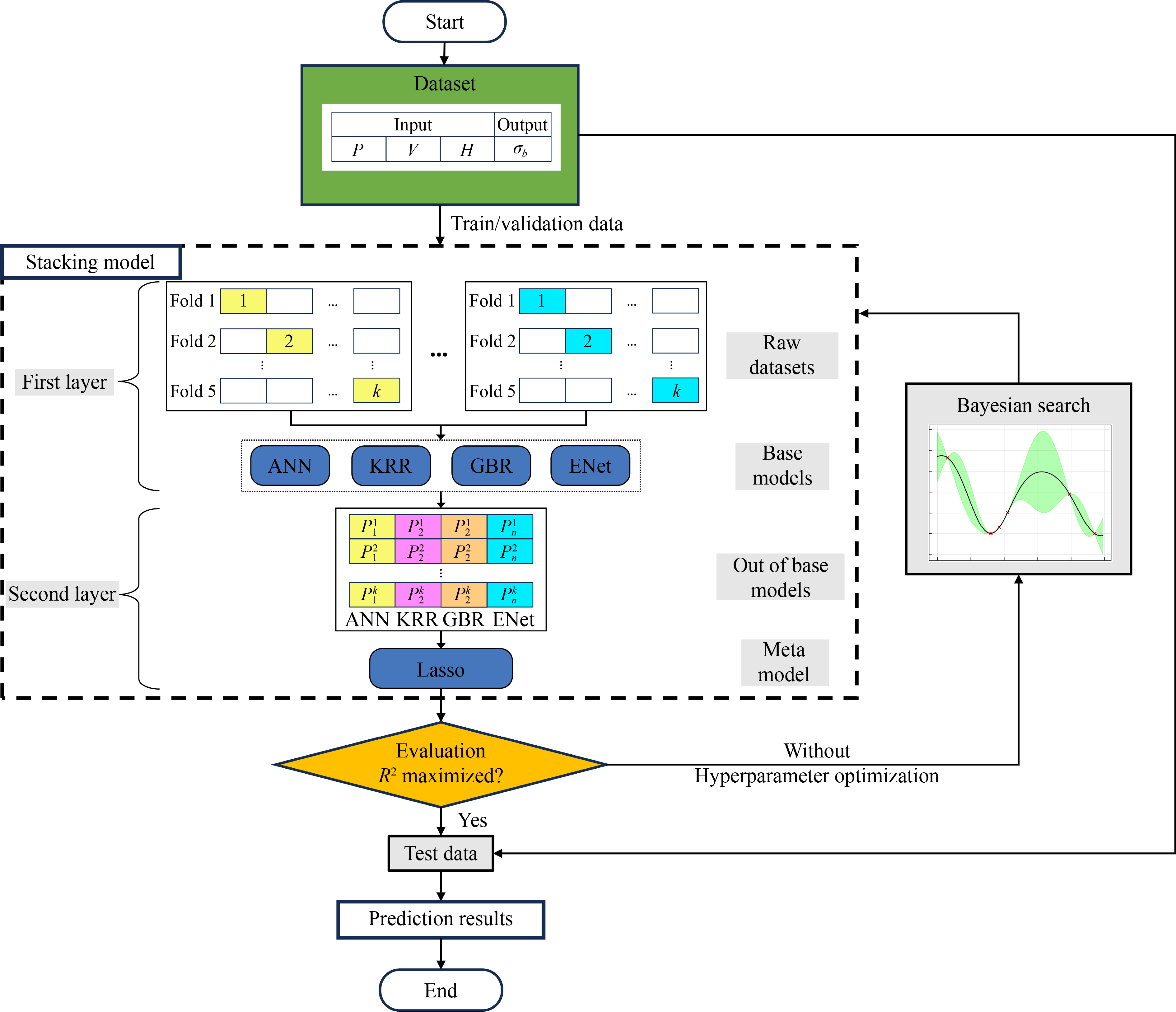 Determining appropriate process parameters in large-scale laser powder bed fusion (LPBF) additive manufacturing pose formidable challenges that necessitate advanced approaches to minimize trial-and-error during experimentation. This work proposed a data-driven approach based on stacking ensemble learning to predict the mechanical properties of Ti6Al4V alloy fabricated by large-scale LPBF for the first time. This method can adapt to the complexity of large-scale LPBF data distribution and exhibits a more generalized predictive capability compared to base models. Specifically, the stacking model utilized artificial neural network (ANN), gradient boosting regressor, kernel ridge regression, and elastic net as base models, with the Lasso model serving as the meta-model. Bayesian optimization and cross-validation were utilized for model optimization and training based on a limited data set, resulting in higher predictive accuracy compared to traditional artificial neural network model. The statistical analysis of the ANN and stacking models indicates that the stacking model exhibits superior performance on the test set, with a coefficient of determination value of 0.944, mean absolute percentage error of 2.51%, and root mean squared error of 27.64, surpassing that of the ANN model. All statistical metrics demonstrate superiority over those obtained from the ANN model. These results confirm that by integrating the base models, the stacking model exhibits superior predictive stability compared to individual base models alone, thereby providing a reliable assessment approach for predicting the mechanical properties of metal parts fabricated by the LPBF process.