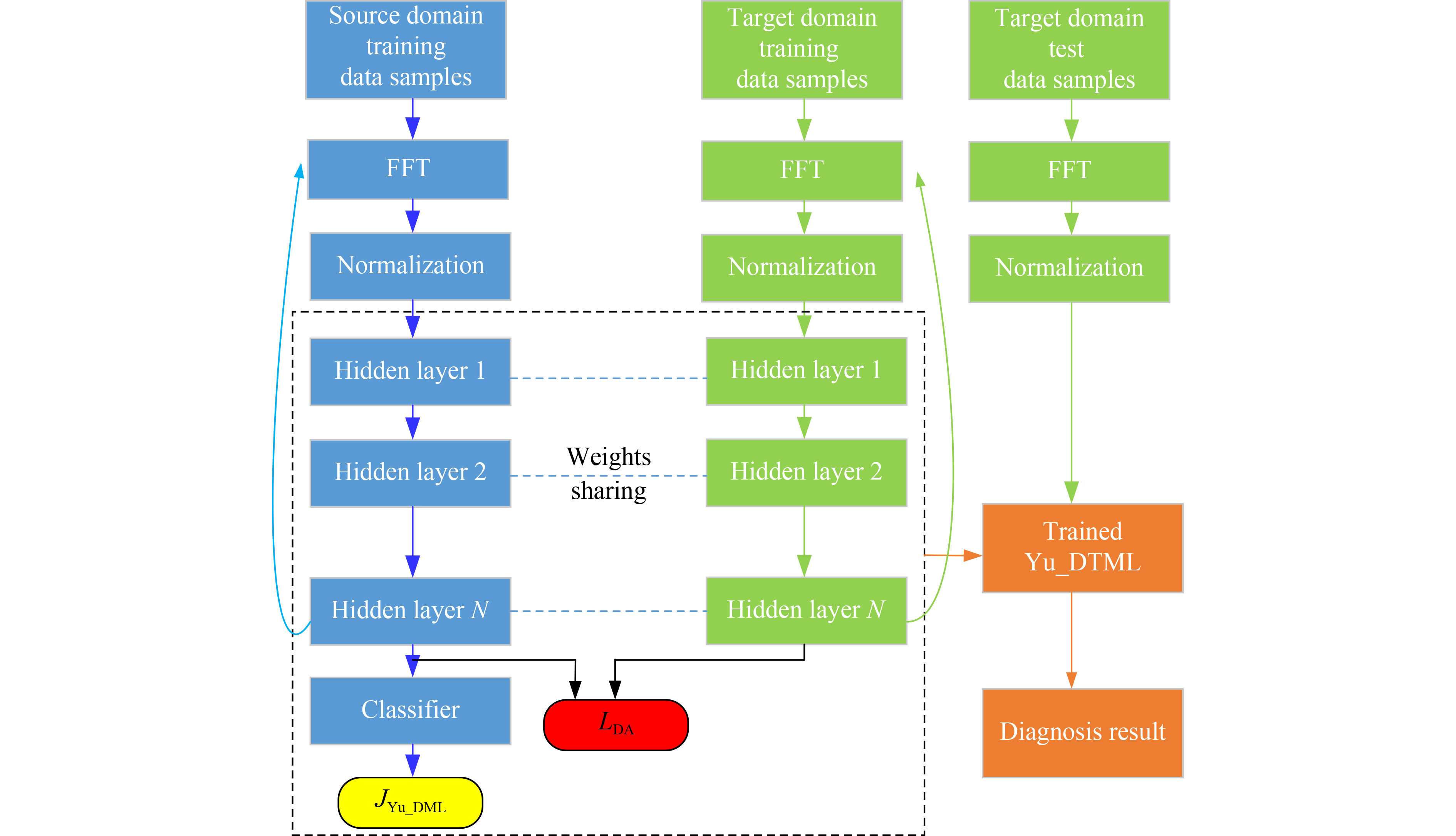 The change of working conditions not only makes the data distribution inconsistent, but also increases the diagnosis difficulty of fuzzy samples at the fault boundary. The traditional distance-based deep metric learning cannot effectively classify the fuzzy samples at the fault boundary. In the traditional transfer learning models, the maximum mean discrepancy (MMD) and joint maximum mean discrepancy only increase the transferability of same-class samples, and neglect the discriminability of different-class samples across different domains. The discriminative joint probability MMD (DJP-MMD) increases the transferability of same-class samples and the discriminability of different-class samples across different domains, but it only considers the global transferability of all fault classes, ignoring the different transferability of each same fault class. Therefore, a Yu norm-based deep transfer metric learning based on weighted DJP-MMD is proposed to further improve the diagnosis accuracy of bearings under variable working conditions. The deep transfer metric learning model adopts the Yu norm-based similarity instead of the distance-based similarity to effectively classify the data samples, especially those at the fault boundary, and uses the weighted DJP-MMD to measure the data distribution discrepancy between the source and target domains to increase the transferability of each same-class samples and discriminability of different-class samples across different domains. Through the fault diagnosis analysis on bearings under variable working conditions, the diagnosis results demonstrate that the proposed deep transfer metric learning model can diagnose bearing faults with higher accuracy, stronger generalization and anti-noise capabilities compared with other fault diagnosis methods based on transfer learning.