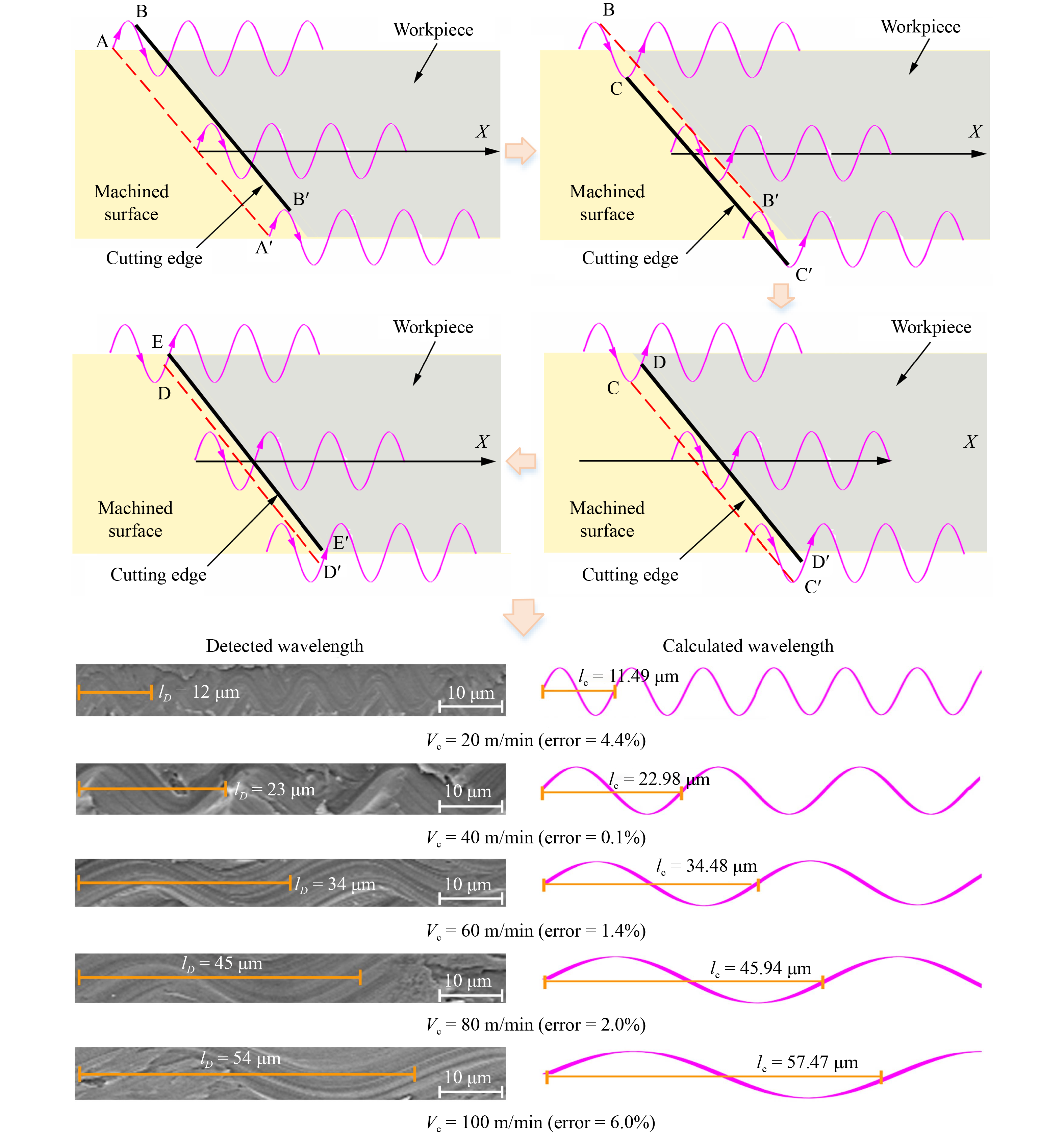 GH4169D superalloy exhibits exceptional service performance, enhancing the capabilities of aero-engines. However, it also poses challenges to component machining. Ultrasonic vibration-assisted machining has demonstrated advantages in enhancing material machinability. However, comprehensive analyses that pertain to the tool cutting edge path, material removal mechanism, and surface texture in longitudinal ultrasonic vibration-assisted side-milling (LUVM) are rare. In this study, GH4169D superalloy was subjected to LUVM and conventional milling (CM) to investigate the material removal mechanism and surface texture generation. Furthermore, a noncutting time ratio model was proposed to predict the reduction in maximum milling force achieved by LUVM. Results indicated that compared with that of CM, the machining of LUVM was divided into milling and noncutting. The inclusion of noncutting contributed to a reduction in the maximum milling force during LUVM. However, as milling speed increased, noncutting time ratio decreased and subsequently diminished the advantage of LUVM. The chip morphology formed using LUVM exhibited a greater degree of curliness compared with that obtained using CM, facilitating chip breaking. The utilization of LUVM resulted in the formation of a thinner lamellar structure on the free surface of chips compared with the use of CM. The machined surface exhibited a distinct ultrasonic vibration texture in LUVM, which was characterized by a physics formula. The utilization of LUVM demonstrated a reduction in machined surface roughness Ra compared with the use of CM at a low milling speed. The findings of this study contribute to the prediction of the effects of LUVM on reducing maximum milling force and achieving control over chip morphologies and machined surface texture.
