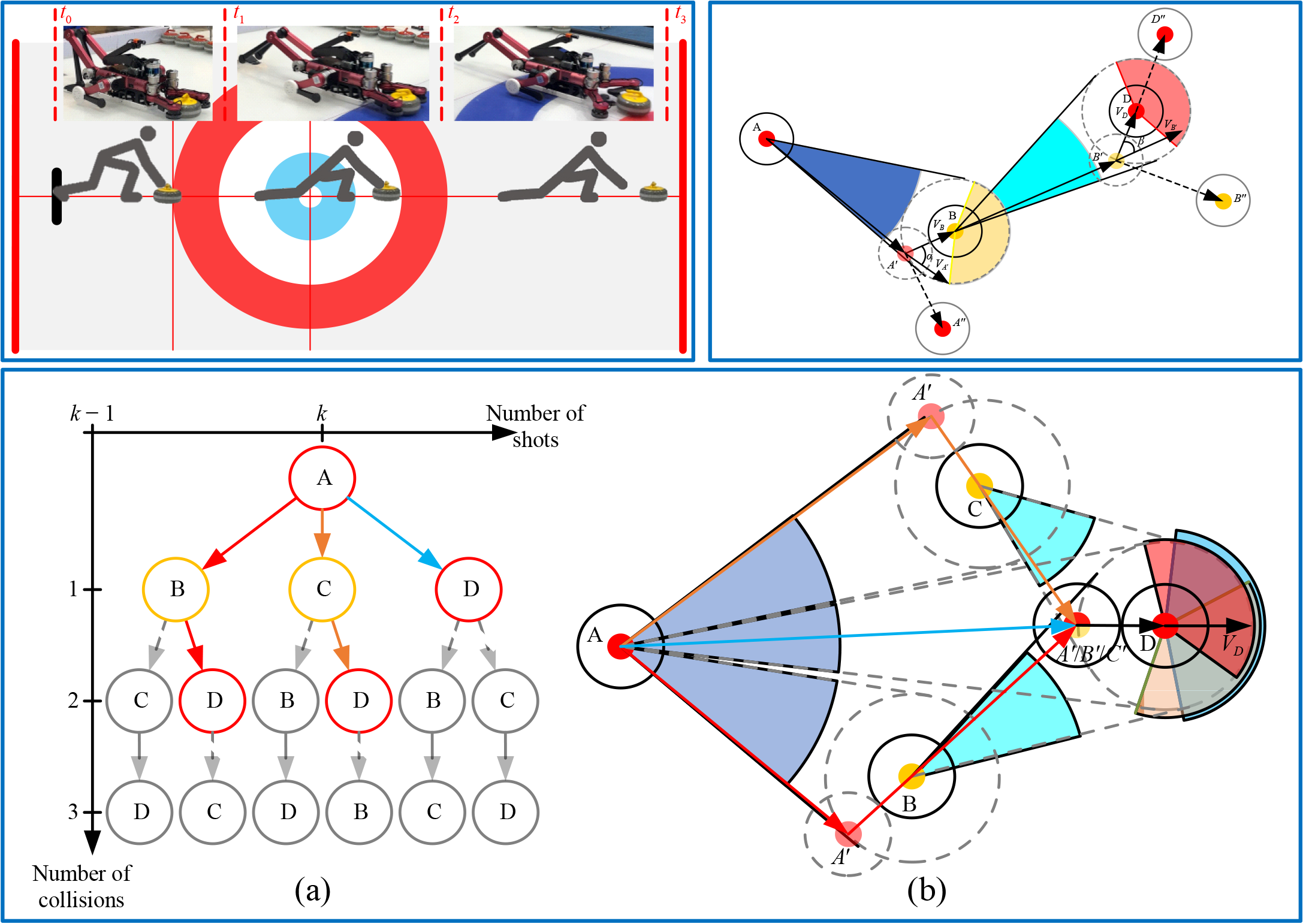 In curling competitions, the throwing strategy has a decisive influence on the outcome of the game. When robots are applied to the sport of curling, they first need to understand the various throwing strategies in curling competitions and then adjust their motion control parameters to achieve the corresponding strategic throws. However, current curling strategy research lacks mathematical analysis and descriptive methods for throwing strategies tailored to robots. Moreover, research on how robots can solve for corresponding throwing strategies is lacking. These limitations have restricted the application and development of curling robots in the sport. Here, the concepts of the curling stone’s hitting domain and hitting tree are introduced to analyze and describe the curling strategies for robots by constructing the curling hitting domain through a curling collision model and by building the hitting tree through operations such as combination, permutation, and pruning. Furthermore, based on the solution methods for hitting domains and hitting trees, a search solution method for the control parameters of robots is developed. The research findings are integrated into a curling robot auxiliary decision-making software. With the help of the auxiliary software, the curling robot achieves victory in competitions against humans. The research outcomes are of great importance for the application and development of curling robots and legged robots.