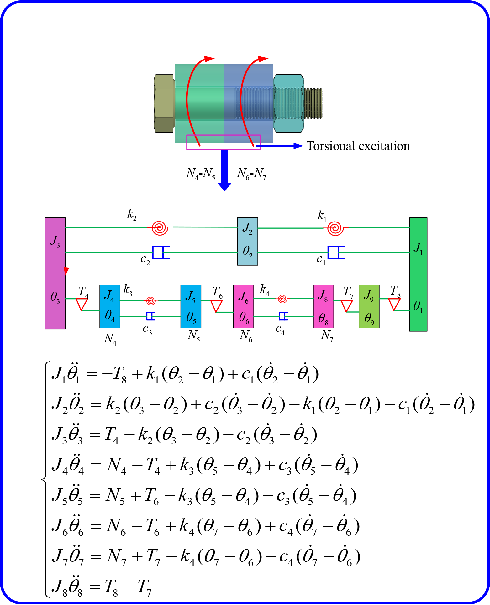 In the rotor system of aero-engines, the main purpose of a bolted flange connection structure is to transfer torque and speed, and the rotor system may exhibit bolt loosening and connection structure failure under complex working conditions, high speed rotation, and external excitation unbalanced force. In addition, the bolted connection structure in the rotor system is mainly subjected to torsional vibration excitation, and using experimental methods to analyze the dynamic response law of different structural parameters of a bolted connection structure under torsional vibration excitation is complicated. Therefore, on the basis of the concentrated mass method and the elastic interaction characteristics within the bolted system, this study establishes dynamic models of one-bolted and multi-bolted connection structural systems under torsional excitation. On the basis of this dynamic model, the dynamic response characteristics of different thread parameters, external excitation, bolt stiffness, and compression stiffness of the connected parts in a one-bolted connection system and the influence laws of different elastic modulus, bolt numbers, and the thickness of the connected parts on the loosening of the multi-bolted connection system are analyzed. Results show that small thread pitch, external excitation amplitude and frequency, compressive stiffness, bolt stiffness, and elastic modulus and large tooth angle, number of bolts, and thickness of connected parts can appropriately improve the anti-loosening performance of the bolted connection system. This study also uses a comparative verification method combining finite element simulation and experiment to verify the correctness of the established dynamic model effectively.