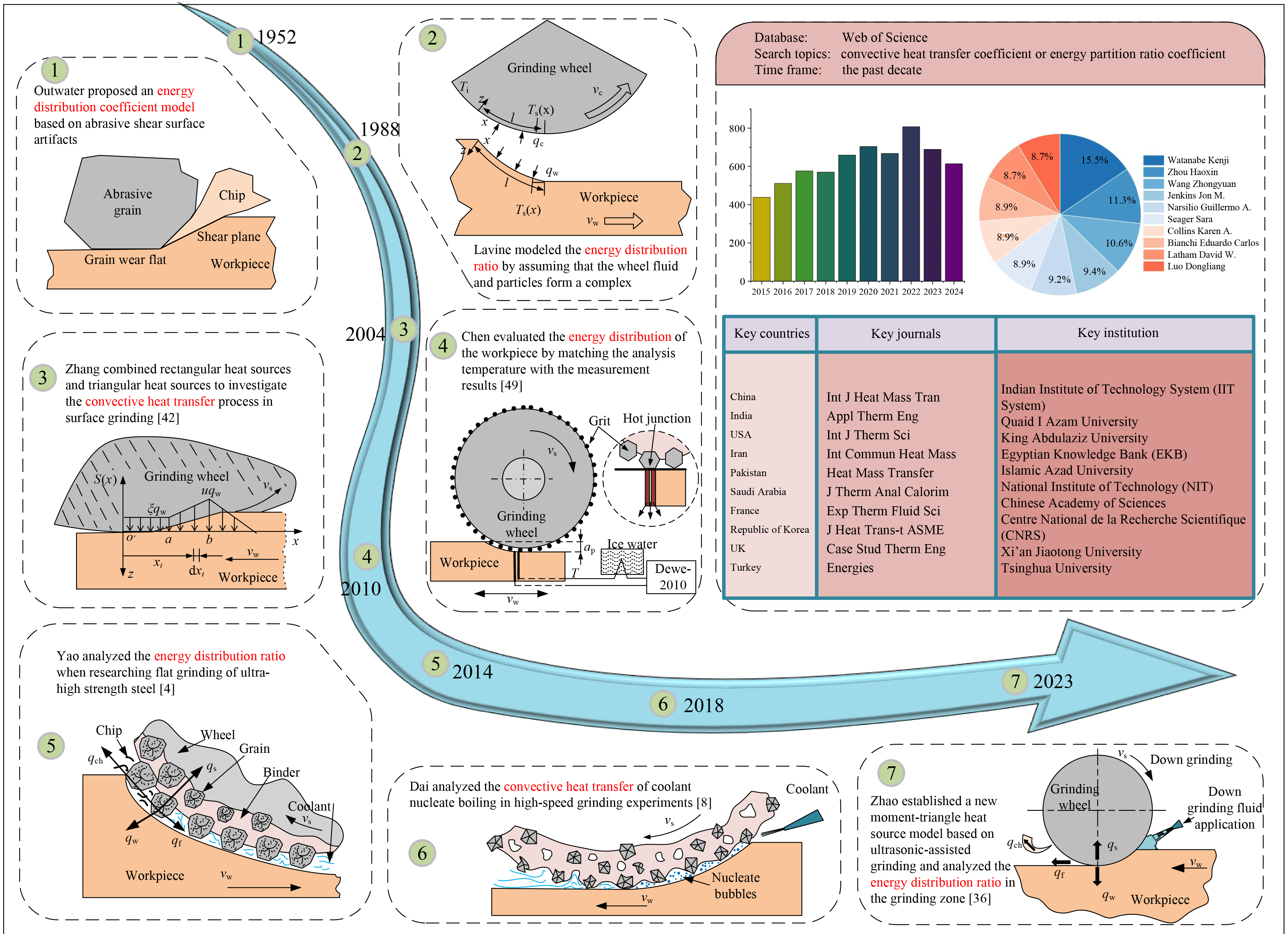 The heat transfer process is a critical topic in the field of cutting and grinding machining, playing a vital role in reducing machining temperatures and improving machining quality. In these operations, heat transfer is generally characterized by specific parameters, including the energy distribution coefficient and the convective heat transfer coefficient. These parameters affect the magnitude and direction of energy flow in the heat transfer process, directly impacting cutting and grinding temperatures. However, comprehensive reviews summarizing current studies on heat transfer processes are lacking. To effectively control heat transfer, thereby managing cutting/grinding temperatures while improving workpiece surface quality, it is essential that we understand how machining parameters, material properties, and cooling methods influence the heat transfer, and this knowledge is critical for guiding the practical production. This paper analyzes and summarizes heat transfer process parameter models in cutting and grinding operations. First, the study examines energy flow and distribution ratios during cutting and grinding processes, classifying and summarizing various energy partition coefficient models based on different research methods. Second, convective cooling mechanisms in cutting and grinding machining are analyzed, summarizing models of convective heat transfer coefficients. The paper then reviews the practical application of these models, highlighting the influence law of each factor on the models. Finally, the most widely recognized and accurate models of heat transfer process parameters are summarized and identified, analyzing the mechanisms by which different factors alter these parameters. Based on current challenges in heat transfer process parameter research, the paper proposes possible future research directions. The goal is to provide theoretical guidance and technical support for advancing research in heat transfer and improving thermal control in machining.
