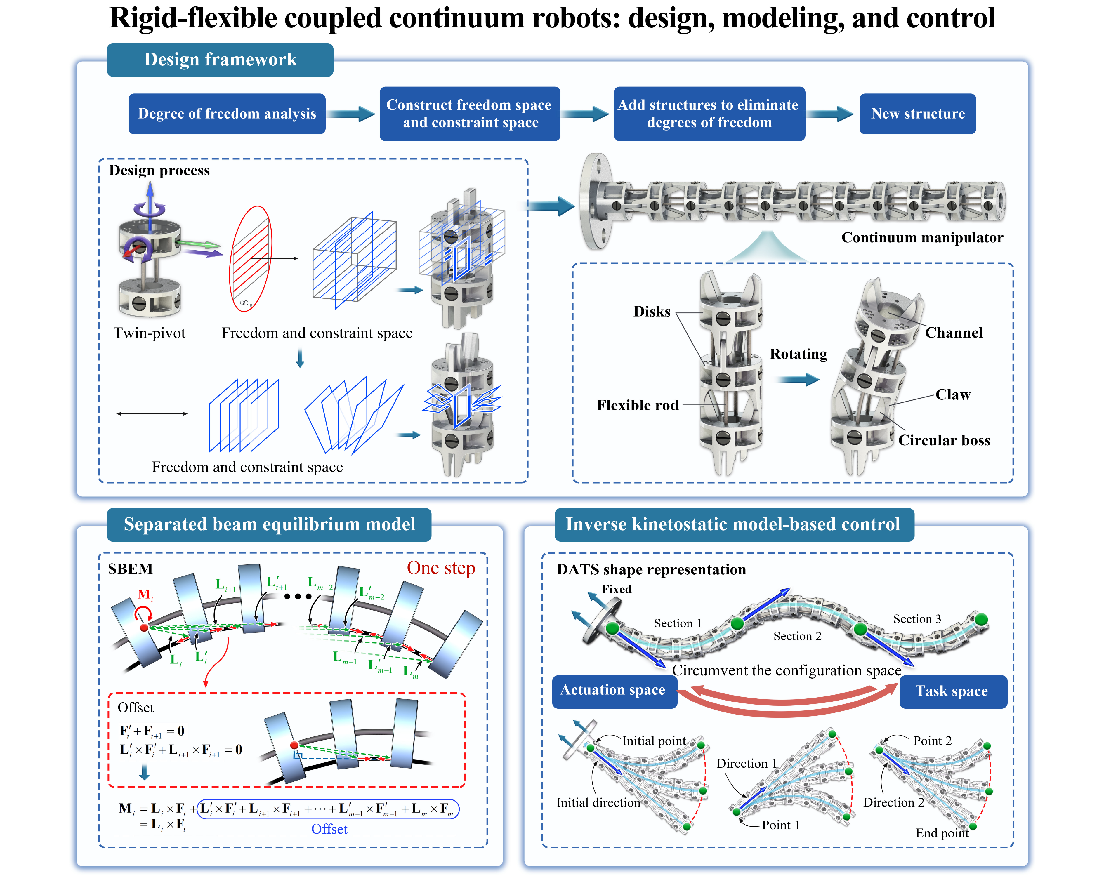This study addresses the challenges of tendon-driven continuum robots in terms of high-performance joint design, high-accuracy and -efficiency mechanical modeling, and inverse kinetostatic-based control. First, a general design framework for rigid–flexible coupled continuum robots is proposed inspired by the Freedom and Constraint Topology theory. Based on this framework, a novel claw-type continuum robot with high torsion resistance, high-precision positioning, and excellent anti-buckling performance is developed. Consequently, a novel kinetostatic model named the separated beam equilibrium model (SBEM) is proposed by solving the equilibrium equations for each unit individually rather than recursively, which achieves high modeling accuracy and efficiency. Finally, an iterative inverse kinetostatic-based control method involving mechanic factors is proposed. Comparative experimental results demonstrate that the claw-type continuum robot outperforms the twin-pivot continuum robot in terms of torsion resistance by more than 300 times. Moreover, the SBEM achieves high morphology estimation accuracy with errors less than 2.91% of manipulator length and high efficiency with more than 20 times improvement for computation reduction compared with the conventional chained beam constraint model. Furthermore, the iterative inverse kinetostatic model-based control obtains a tip error less than 3.70% of manipulator length by only using the open-loop method. The proposed design, modeling, and control method exhibits vast potential for continuum robots when tackling challenging tasks such as inspection, maintenance, and medical surgery in confined and unstructured environments including engine flow paths, nuclear conduits, and human body cavities.
