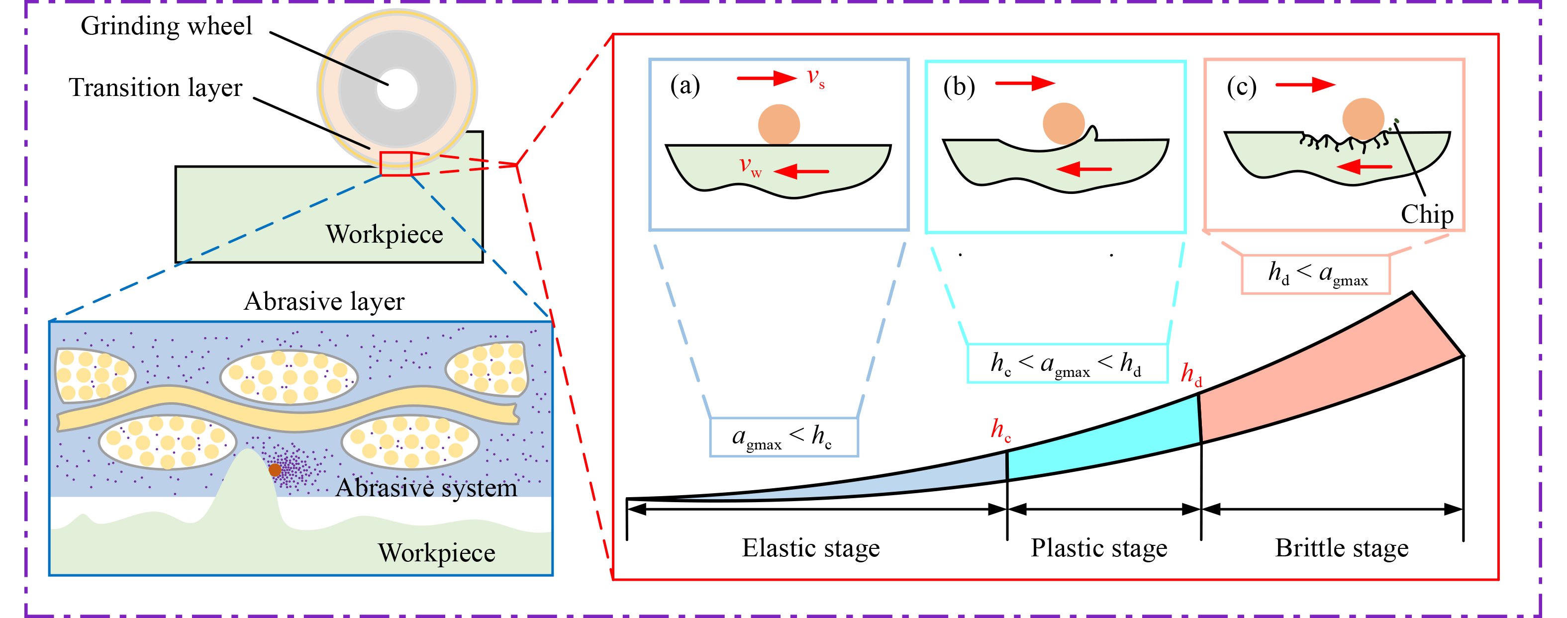 A material removal mechanism is a prerequisite to maintaining high-quality surfaces for high-shear and low-pressure grinding using body-armor-like grinding wheels (BAGWs). However, the pressure distribution and material removal efficiency for machining brittle materials using BAGWs remain unclear. This research investigated two types of elastic deformations during grinding by analyzing the contact mechanism between BAGWs and the workpiece. Additionally, the model of elastohydrodynamic pressure distribution was refined, and the material removal mechanism for machining brittle materials, incorporating the maximum undeformed chip thickness, was revealed. A material removal rate (MRR) model was established based on Hertzian contact, ductile-brittle transition, and spherical indentation theory. The theoretical model was validated through single-factor experiments utilizing a high-shear and low-pressure grinding experimental platform. At a normal grinding force of 15 N and a grinding speed of 10 m/s, the MRR could reach up to 0.276 mm3/s. The experimental results revealed that the model could accurately predict the MRR under various grinding parameters, with an average prediction error of 8.5%.