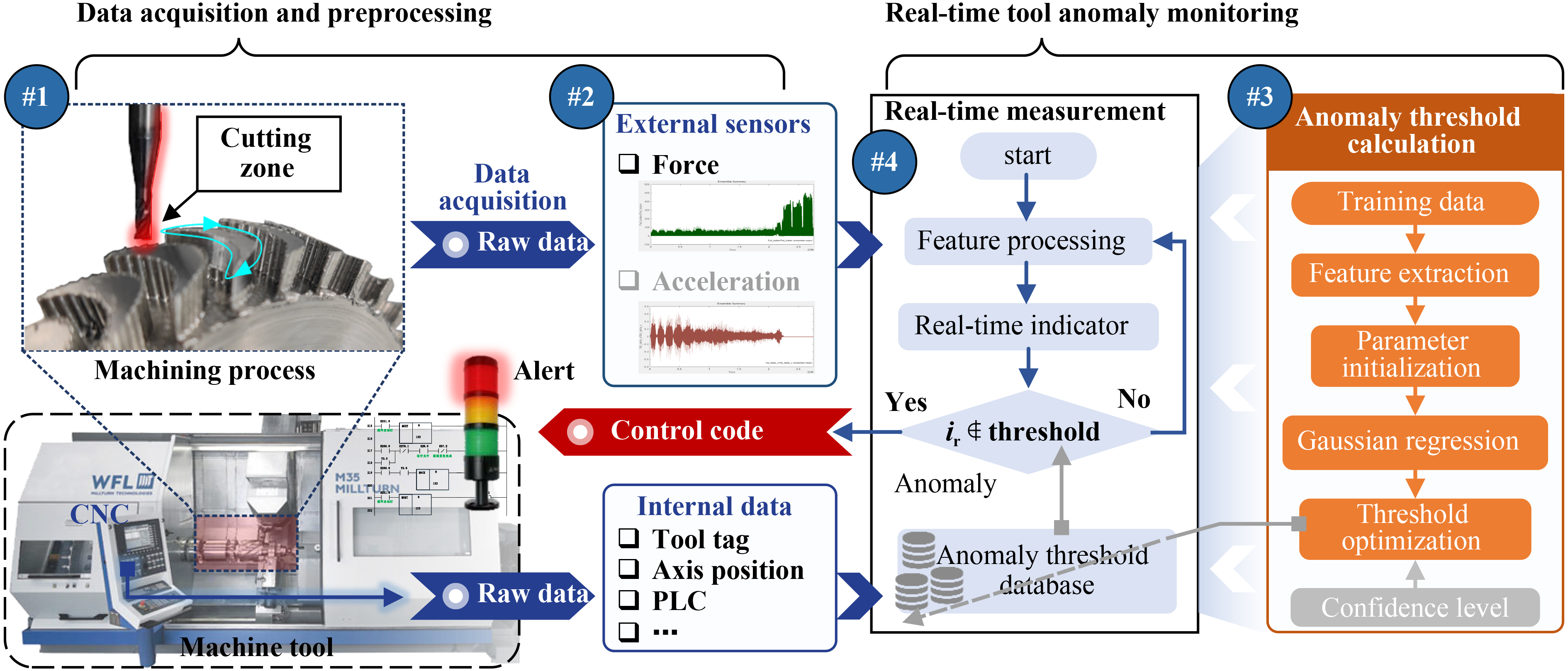 Tool anomalies in computer numerical control (CNC) milling processes are unpredictable, hindering the promotion of fully automated machining. Traditional detection systems often struggle with stability due to the irregular and non-parametric nature of signals generated during dynamic milling. This study proposes an improved probability and statistics-based model for constructing tool anomaly thresholds in the time domain, with the decision-making strategy seamlessly integrated into CNC milling systems. A robust data acquisition and preprocessing framework was developed to improve the accuracy and reliability of real-time monitoring data. A Gaussian process model was employed to construct an anomaly detection threshold data set from irregular signals. Anomalies were identified when monitoring indicators surpassed the established threshold. The proposed method was validated through milling experiments of a turbine blisk, demonstrating an overall anomaly detection accuracy of 91.45%, which exceeds those of four other typical anomaly detection methods. These results confirm the effectiveness of the proposed method and its potential applicability in industry.