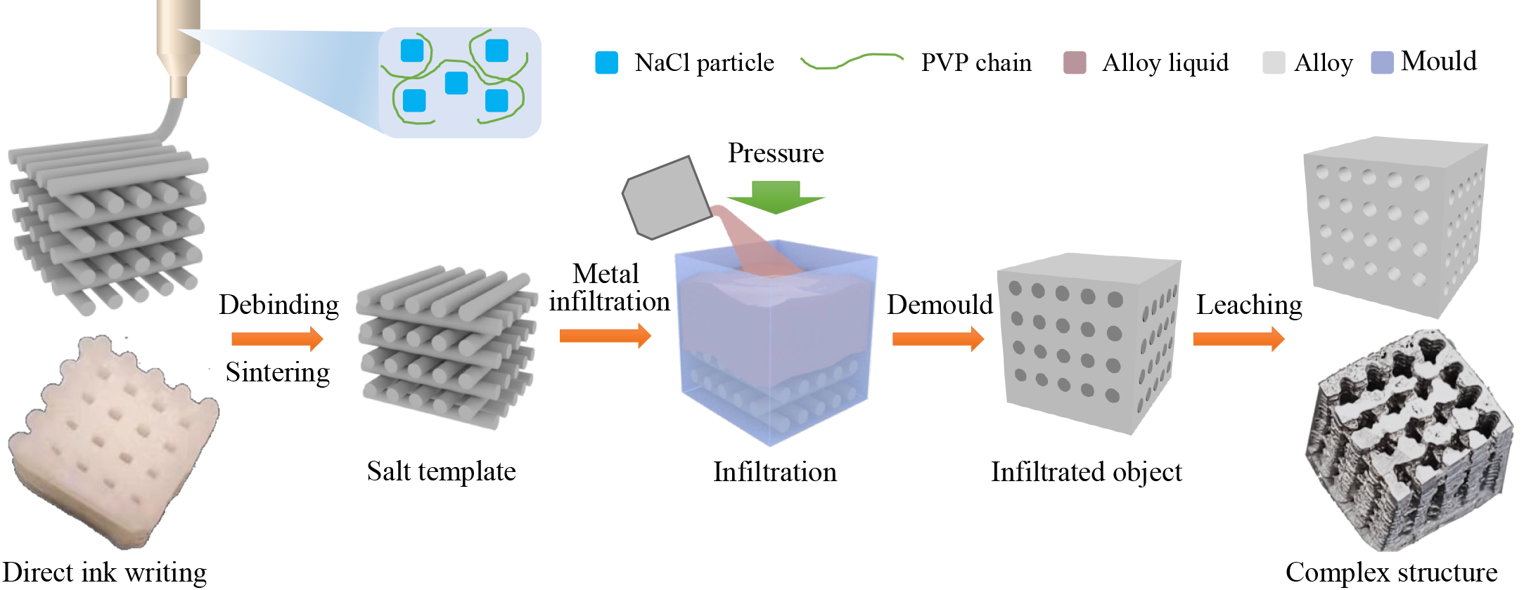 Hierarchical and porous complex metal structures have important prospects in biomedical medicine, aerospace, and other important industries. Current processing methods, including conventional and additive manufacturing, still face many challenges in fabricating metal structures with complex internal structures, especially aluminum alloy ones. Metal molten infiltration on the basis of sacrificial salt templates provides a feasible solution for manufacturing complex internal structures of aluminum alloy, and the development of paste for direct ink writing is pivotal for the successful fabrication of salt templates. This study introduces a novel salt-based paste for printing sacrificial templates by direct ink writing. A print analysis model is formulated based on direct ink writing. Model and experimental results show a remarkable link between strut size and printing pressure and moving speed, but no such link exists between strut size and nozzle height. The paste can be printed into various complex structures by direct ink writing devices. Complex structures of aluminum alloys can be fabricated by metal infiltration and leaching of salt templates. This work provides a new reference technology for fabricating aluminum alloys with complex structures in the future.