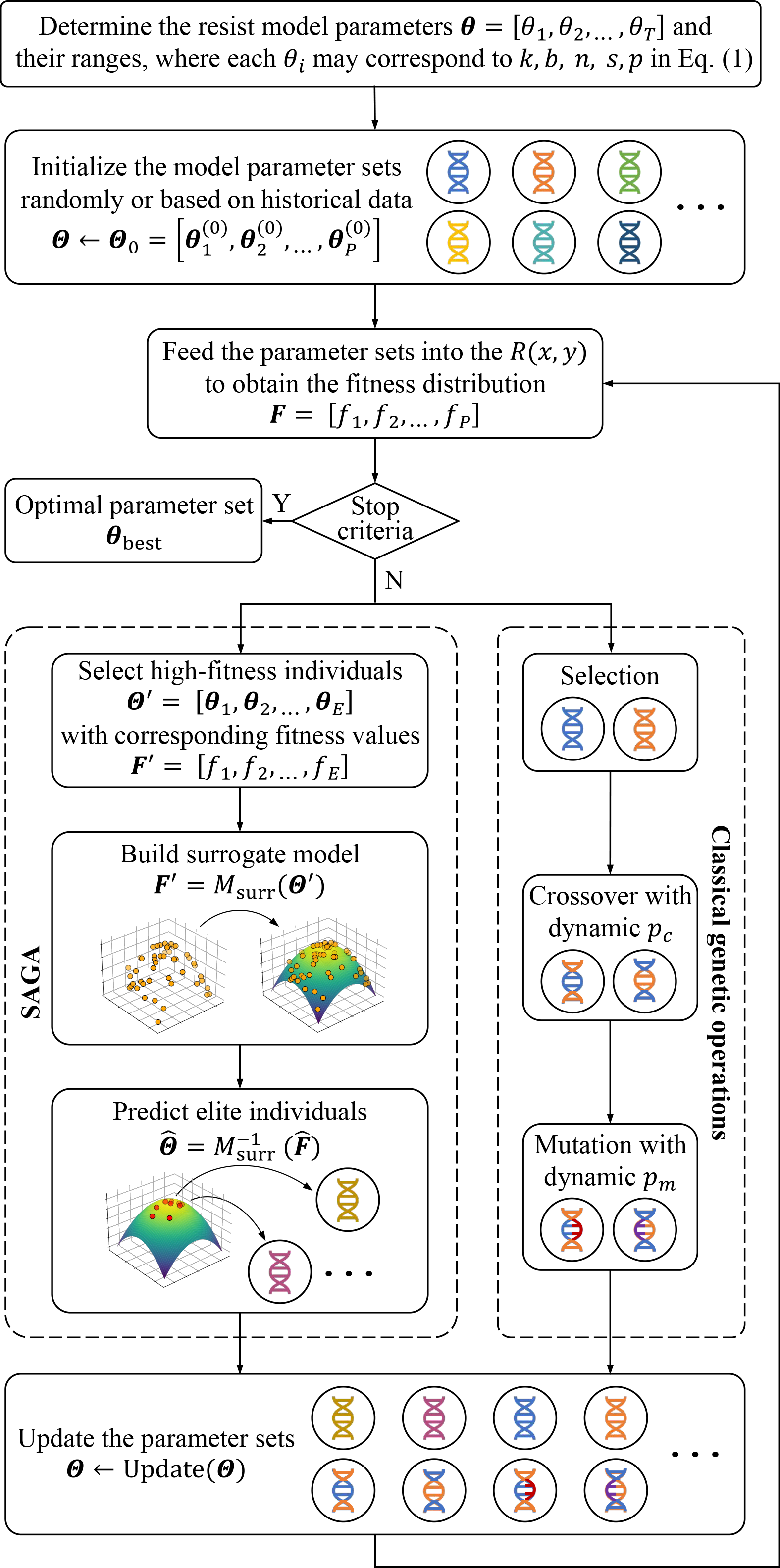 As semiconductor manufacturing moves toward fine feature sizes, precise and efficient resist model calibration has become crucial for optical proximity correction to ensure pattern fidelity. However, traditional calibration methods struggle with efficiency and scalability and are prone to becoming trapped in local optima. Herein, we propose a surrogate-assisted genetic algorithm (SAGA) that integrates Kriging interpolation-based surrogate models and dynamic adaptive mechanisms to optimize resist model coefficients, convolution kernel parameters, and aerial image settings jointly. By leveraging surrogate models to predict high-performance solutions and adaptively adjusting crossover/mutation rates, SAGA balances global exploration and local exploitation, achieving rapid convergence and superior model accuracy compared with other algorithms. Experimental validation across three resist cases demonstrates that SAGA outperforms conventional genetic algorithms and grid search. Compared with other algorithms, SAGA not only achieves higher accuracy but also converges faster, with its optimization trajectories stabilizing earlier in the iterative process. These results highlight SAGA’s potential for efficient and high-precision resist calibration in computational lithography.