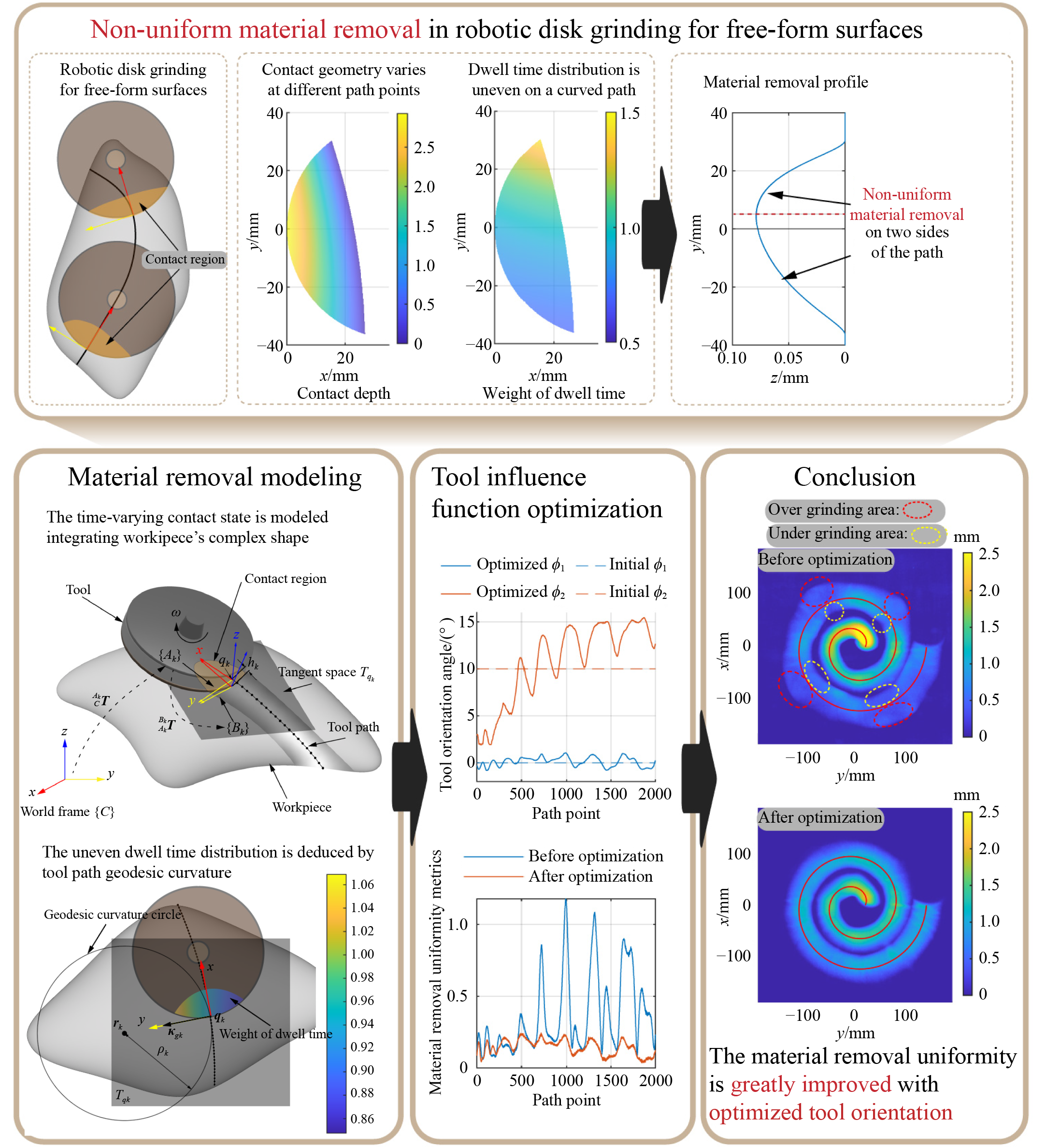 In a convolution material removal process, taking grinding free-form surfaces as an example, the workpiece’s complex shape may lead to dynamic tool–workpiece contact state, and the curved tool path results in an uneven dwell time distribution. These factors contribute to non-uniform material removal (NMR), causing over-grinding or under-grinding in localized areas. This work aims to model NMR accurately and propose a method to enhance material removal uniformity. First, a dynamic tool–workpiece contact model integrating the workpiece’s complex shape, contact force, and the mechanical properties of the tool and the workpiece is proposed by introducing the measured workpiece point cloud. Second, path geodesic curvature is employed to calculate the dwell time distribution. Third, a material removal model that combines the dynamic tool–workpiece contact and the uneven dwell time distribution is introduced. Then, the tool influence function is optimized by adjusting the tool orientation to improve material removal uniformity. Finally, the proposed material removal model and optimization method are validated through experiments, with results showing a remarkable improvement in material removal uniformity using this approach.