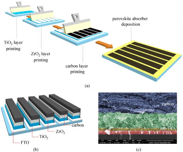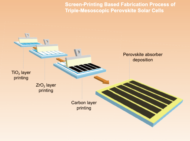 The triple-mesoscopic perovskite solar cells are fabricated by a screen-printing technique based process, which is fast and compatible with commercial production lines. By optimizing the compositions of the pastes and the printing parameters, TiO2, ZrO2 and Carbon films with desired dimensions can be effectively deposited on transparent conducting substrates. After infiltrating the perovskite absorber in the mesoporous scaffold, the fabrication of triple-mesoscopic perovskite solar cells is completed. Since no expensive hole transporting mate [Detail] ...
