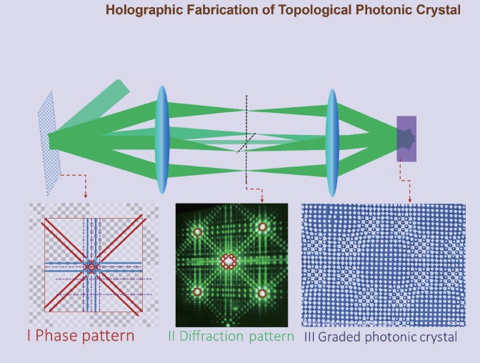 Graded photonic super-crystals have been fabricated through holographic lithography. A phase pattern was generated through pixel-by-pixel phase engineering. A 532 nm laser was incident onto the phase pattern displayed in a spatial light modulator. A diffraction pattern was generated and imaged through a 4f system. A Fourier filter was placed to let pass four outer beams and eight inner beams. These twelve beams were overlapped to form an interference pattern. A photoresist mixture received the exposure of the interference pattern. After the photoresist development [Detail] ...