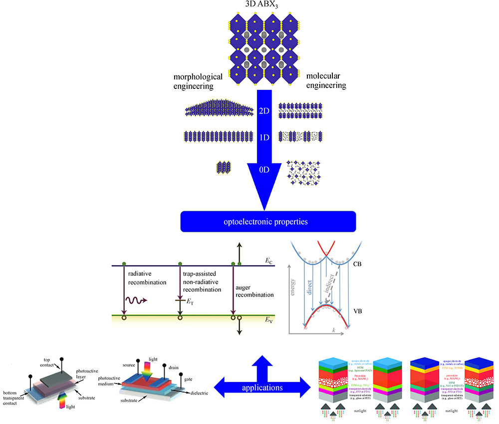 Metal halide perovskites are a class of materials that are ideal for photodetectors and solar cells due to their excellent optoelectronic properties. Their low-cost and low temperature synthesis have made them attractive for extensive research aimed at revolutionizing the semiconductor industry. The rich chemistry of metal halide perovskites allows compositional engineering resulting in facile tuning of the desired optoelectronic properties. Moreover, using different experimental synthesis and deposition techniques such as solution processing, chemical vapor deposition and hot-injection methods, the dimensionality of the perovskites can be altered from 3D to 0D, each structure opening a new realm of applications due to their unique properties. Dimensionality engineering includes both morphological engineering–reducing the thickness of 3D perovskite into atomically thin films–and molecular engineering–incorporating long-chain organic cations into the perovskite mixture and changing the composition at the molecular level. The optoelectronic properties of the perovskite structure including its band gap, binding energy and carrier mobility depend on both its composition and dimensionality. The plethora of different photodetectors and solar cells that have been made with different compositions and dimensions of perovskite will be reviewed here. We will conclude our review by discussing the kinetics and dynamics of different dimensionalities, their inherent stability and toxicity issues, and how reaching similar performance to 3D in lower dimensionalities and their large-scale deployment can be achieved.
