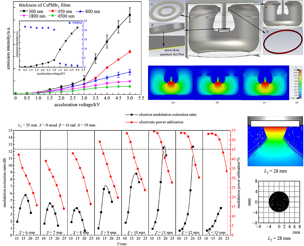 Although laser pumping using electron beam (EB) has high transient power output and easy modulation based on perovskite quantum dot (PQD) film, its lasing emitting direction is the same as the pumped EB’s direction. Thus, realizing the conventional direct device structure through the film lasing mechanism is extremely difficult. Therefore, using the random lasing principle, herein, we proposed a corona modulation device structure based on PQDs random laser pumped using an EB. We discussed and stimulated the optimized designed method of the device in terms of parameters of the electronic optical device and the utilization ratio of output power and its modulation extinction ratio, respectively. According to the simulation results, this type of device structure can effectively satisfy the new random lasing mechanism in terms of high-speed and high-power modulation.