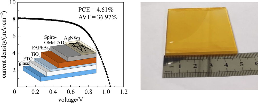 Organic–inorganic hybrid perovskite solar cells have generated wide interest due to the rapid development of their photovoltaic conversion efficiencies. However, the majority of the reported devices have been fabricated via spin coating with a device area of <1 cm2. In this study, we fabricated a wide-bandgap formamidinium lead bromide (FAPbBr3) film using a cost-effective, high-yielding doctor-blade-coating process. The effects of different surfactants, such as l-α-phosphatidylcholine, polyoxyethylene sorbitan monooleate, sodium lauryl sulfonate, and hexadecyl trimethyl ammonium bromide, were studied during the printing process. Accompanying the optimization of the blading temperature, crystal sizes of over 10 mm and large-area perovskite films of 5 cm × 5 cm were obtained using this method. The printed FAPbBr3 solar cells exhibited a short-circuit current density of 8.22 mA/cm2, an open-circuit voltage of 1.175 V, and an efficiency of 7.29%. Subsequently, we replaced the gold with silver nanowires as the top electrode to prepare a semitransparent perovskite solar cell with an average transmittance (400–800 nm) of 25.42%, achieving a high-power efficiency of 5.11%. This study demonstrates efficient doctor-blading printing for preparing large-area FAPbBr3 films that possess high potential for applications in building integrated photovoltaics.