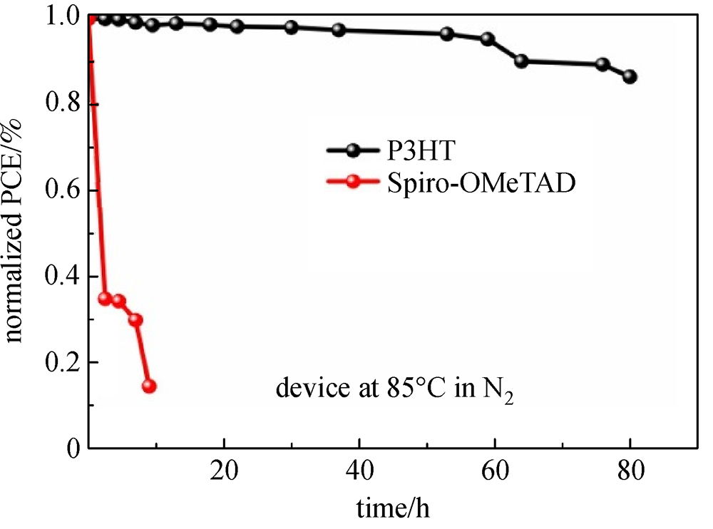 Cesium-based inorganic perovskite solar cells (PSCs) are paid more attention because of their potential thermal stability. However, prevalent salt-doped 2,2′,7,7′-tetrakis(N,N-dipmethoxyphenylamine)9,9′-spirobifluorene (Spiro-OMeTAD) as hole-transport materials (HTMs) for a high-efficiency inorganic device has an unfortunate defective thermal stability. In this study, we apply poly(3-hexylthiophene-2,5-diyl) (P3HT) as the HTM and design all-inorganic PSCs with an indium tin oxide (ITO)/SnO2/LiF/CsPbI3−xBrx/P3HT/Au structure. As a result, the CsPbI3−xBrx PSCs achieve an excellent performance of 15.84%. The P3HT HTM-based device exhibits good photo-stability, maintaining ~80% of their initial power conversion efficiency over 280 h under one Sun irradiation. In addition, they also show better thermal stability compared with the traditional HTM Spiro-OMeTAD.