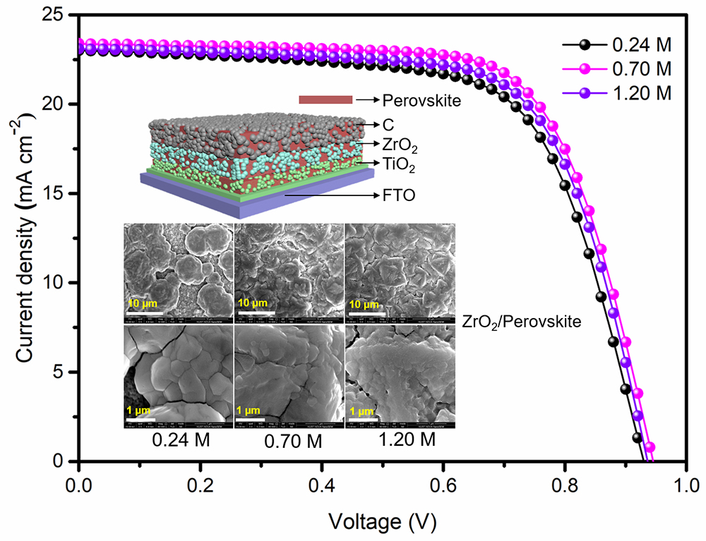 Over the last decade, the power conversion efficiency of hybrid organic–inorganic perovskite solar cells (PSCs) has increased dramatically from 3.8% to 25.2%. This rapid progress has been possible due to the accurate control of the morphology and crystallinity of solution-processed perovskites, which are significantly affected by the concentration of the precursor used. This study explores the influence of precursor concentrations on the performance of printable hole-conductor-free mesoscopic PSCs via a simple one-step drop-coating method. The results reveal that lower concentrations lead to larger grains with inferior pore filling, while higher concentrations result in smaller grains with improved pore filling. Among concentrations ranging from 0.24–1.20 M, devices based on a moderate strength of 0.70 M were confirmed to exhibit the best efficiency at 16.32%.