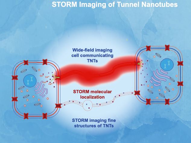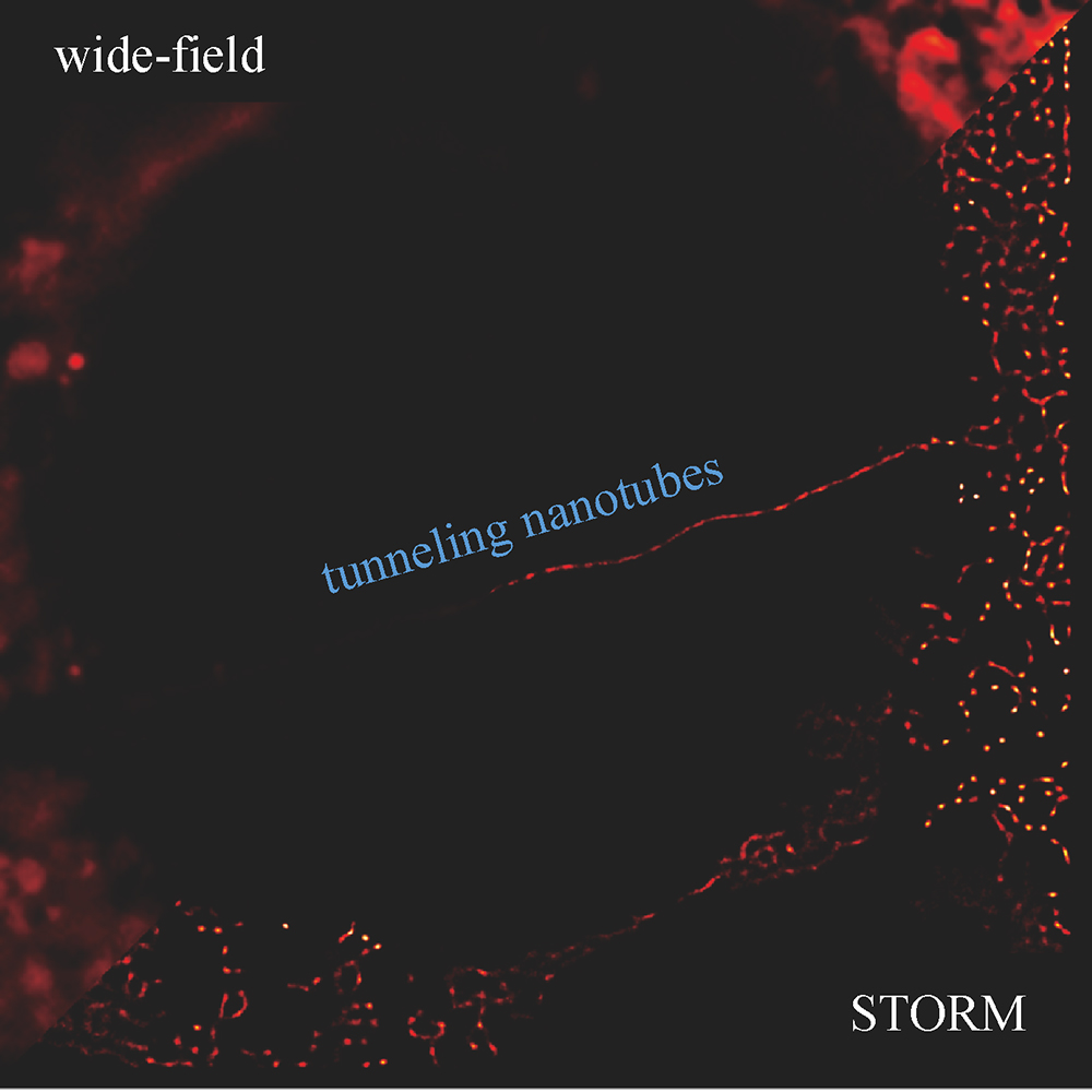 As a new method of cell–cell communication, tunneling nanotubes (TNTs) play important roles in cell–cell signaling and mass exchanges. However, a lack of powerful tools to visualize dynamic TNTs with high temporal/spatial resolution restricts the exploration of their formation and cleavage, hindering the complete understanding of its mechanism. Herein, we present the first example of using stochastic optical reconstruction microscopy (STORM) to observe the tube-like structures of TNTs linking live cells with an easily prepared fluorescent dye. Because of this new imaging microscopy, the cleavage process of TNTs was observed with a high spatial resolution.