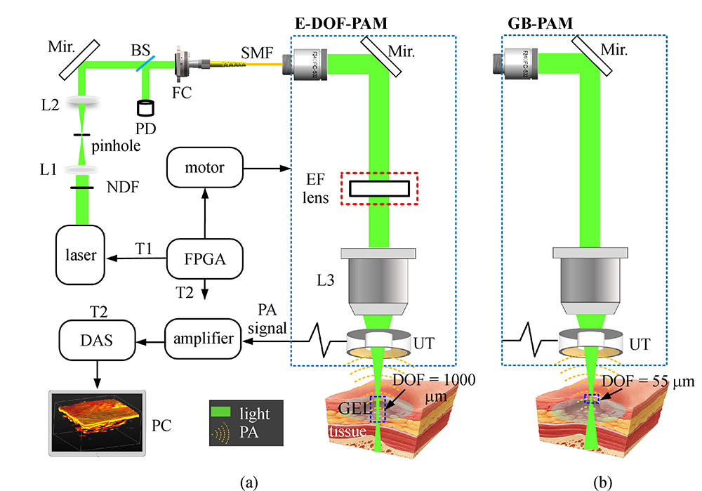 Faster and better wound healing is a critical medical issue. Because the repair process of wounds is closely related to revascularization, accurate early assessment and postoperative monitoring are very important for establishing an optimal treatment plan. Herein, we present an extended depth-of-field photoacoustic microscopy system (E-DOF-PAM) that can achieve a constant spatial resolution and relatively uniform excitation efficiency over a long axial range. The superior performance of the system was verified by phantom and in vivo experiments. Furthermore, the system was applied to the imaging of normal and trauma sites of volunteers, and the experimental results accurately revealed the morphological differences between the normal and traumatized skin of the epidermis and dermis. These results demonstrated that the E-DOF-PAM is a powerful tool for observing and understanding the pathophysiology of cutaneous wound healing.