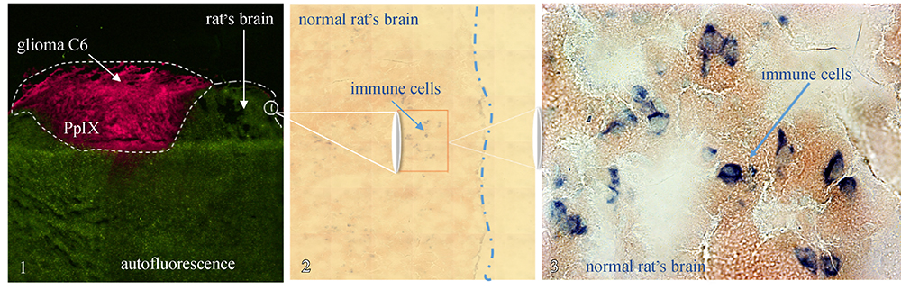 The brain has an exceptionally high requirement for energy metabolism, with glucose serving as the exclusive energy source. Cancers, including glioblastoma, have a high glucose uptake and rely on aerobic glycolysis for energy metabolism. The alternation of high-efficiency oxidative phosphorylation to a low-efficiency aerobic glycolysis pathway (Warburg effect) provides macromolecules for biosynthesis and proliferation. Current research indicates that the specific metabolism in the tumor tissue and normal brain tissue in the glioma allows the use of 5-aminolevulinic acid (5 ALA)-induced protoporphyrin IX (PpIX) and methylene blue (MB) to monitor and correct the development of the tumor. The focus is on the detection of the differences between tumor cells and tumor-associated macrophages/microglia using spectroscopic and microscopic methods, based on the fluorescent signals and the difference in the drug accumulation of photosensitizers (PSs). Since 5 ALA has long been used effectively in the clinic for fluorescent surgical navigation, it was employed as an agent to identify the localization of tumor tissue and study its composition, particularly tumor and immune cells (macrophages), which have also been shown to actively accumulate PpIX. However, since PpIX is photodynamically active, it can be considered effective as the main target of tumor tissue for further successful photodynamic therapy. MB was employed to visualize resident microglia, which is important for their activation/deactivation to prevent the reprogramming of the immune cells by the tumor. Thus, using two drugs, it is possible to prevent crosstalk between tumor cells and the immune cells of different geneses.