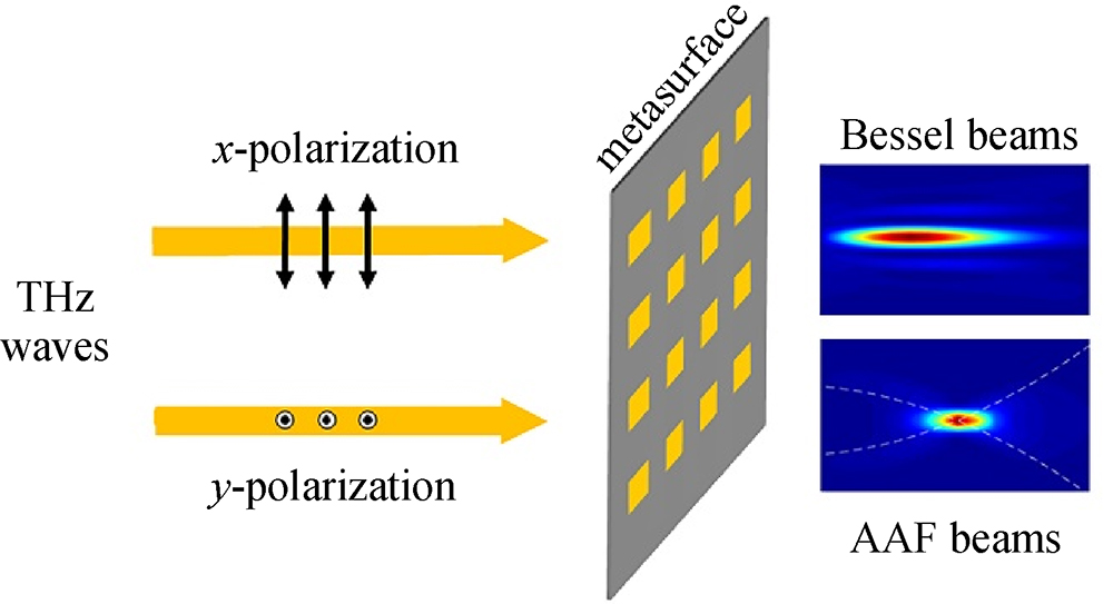 The applications of terahertz (THz) technology can be greatly extended using non-diffractive beams with unique field distributions and non-diffractive transmission characteristics. Here, we design and experimentally demonstrate a set of dual non-diffractive THz beam generators based on an all-dielectric metasurface. Two kinds of non-diffractive beams with dramatically opposite focusing properties, Bessel beam and abruptly autofocusing (AAF) beam, are considered. A Bessel beam with long-distance non-diffractive characteristics and an AAF beam with low energy during transmission and abruptly increased energy near the focus are generated for x- and y-polarized incident waves, respectively. These two kinds of beams are characterized and the results agree well with simulations. In addition, we show numerically that these two kinds of beams can also carry orbital angular momentum by further imposing proper angular phases in the design. We believe that these metasurface-based beam generators have great potential use in THz imaging, communications, non-destructive evaluation, and many other fields.
