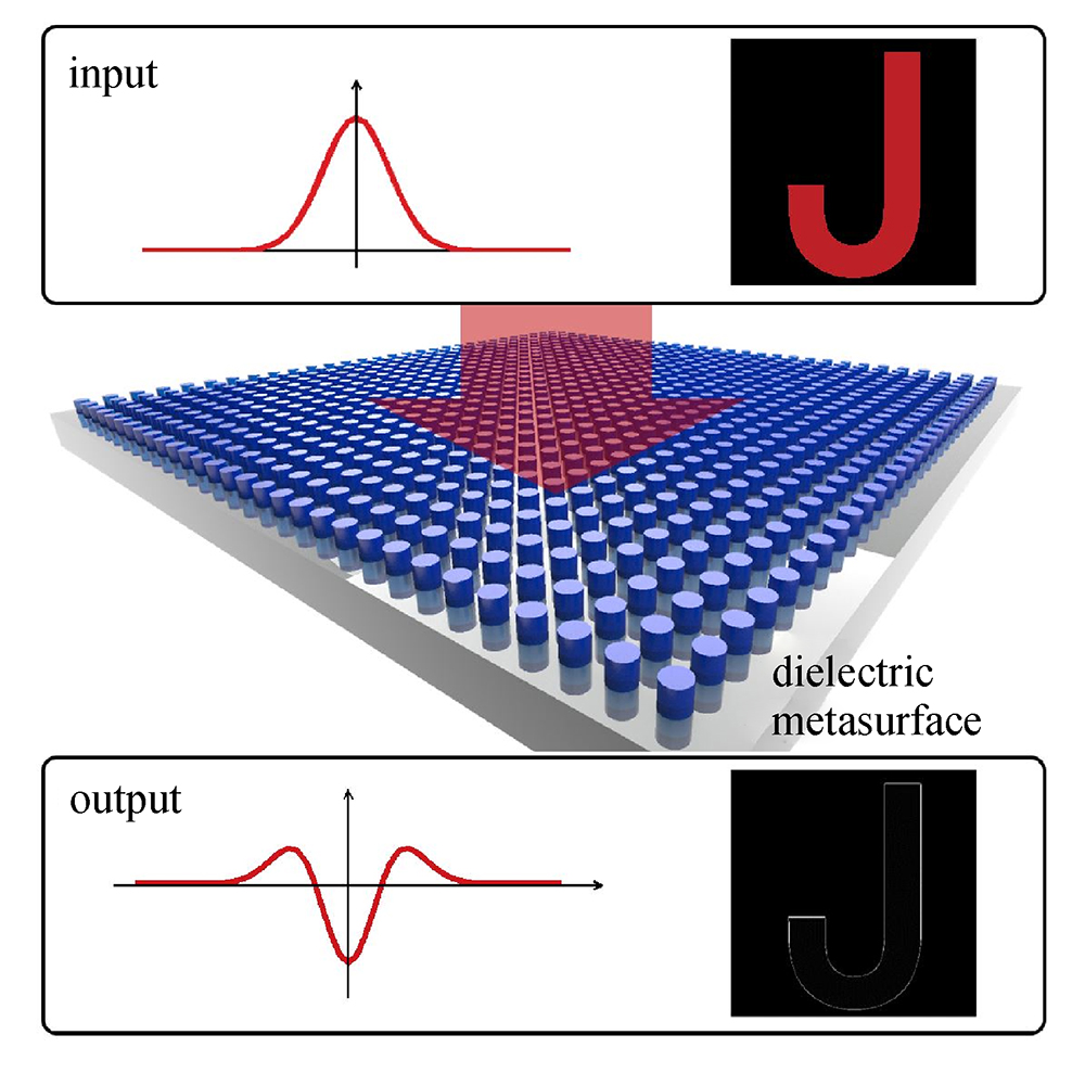 Dielectric metasurfaces-based planar optical spatial differentiator and edge detection have recently been proposed to play an important role in the parallel and fast image processing technology. With the development of dielectric metasurfaces of different geometries and resonance mechanisms, diverse on-chip spatial differentiators have been proposed by tailoring the dispersion characteristics of subwavelength structures. This review focuses on the basic principles and characteristic parameters of dielectric metasurfaces as first- and second-order spatial differentiators realized via the Green’s function approach. The spatial bandwidth and polarization dependence are emphasized as key properties by comparing the optical transfer functions of metasurfaces for different incident wavevectors and polarizations. To present the operational capabilities of a two-dimensional spatial differentiator in image information acquisition, edge detection is described to illustrate the practicability of the device. As an application example, experimental demonstrations of edge detection for different biological cells and a flower mold are discussed, in which a spatial differentiator and objective lens or camera are integrated in three optical pathway configurations. The realization of spatial differentiators and edge detection with dielectric metasurfaces provides new opportunities for ultrafast information identification in biological imaging and machine vision.