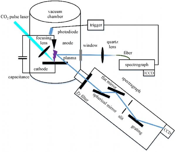 In this paper, a CO2 laser induced discharge plasma extreme ultraviolet (EUV) source experimental device was established. The optical emission spectroscopy was used to diagnose the characteristics of the plasma, and the evolution of electron temperature and electron density with time was obtained. The influence of discharge voltage on plasma parameters was analyzed and discussed. The EUV radiation characteristics of the plasma were investigated by self-made grazing incidence EUV spectrometer. The EUV radiation intensity and conversion efficiency were discussed.
