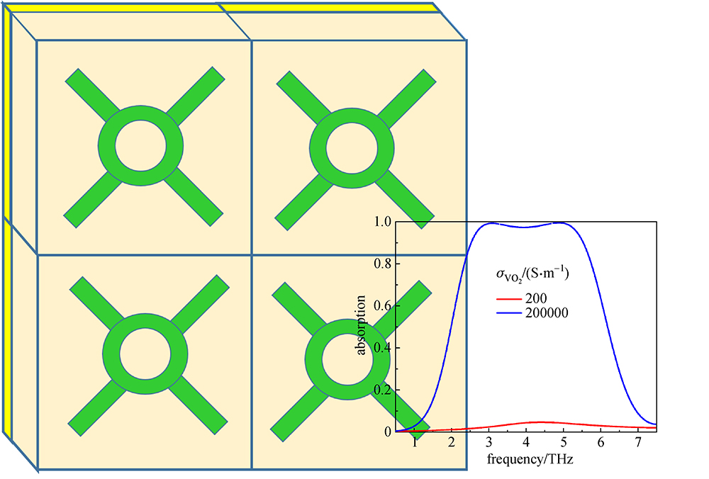 In this work, we present the design of a polarization independent broadband absorber in the terahertz (THz) frequency range using a metasurface resonator. The absorber comprises of three layers, of which, the top layer is made of a vanadium dioxide (VO2) resonator with an electrical conductivity of σ = 200000 S/m; the bottom layer consists of a planar layer made of gold metal, and a dielectric layer is sandwiched between these two layers. The optimized absorber exhibits absorption greater than 90% from 2.54−5.54 THz. Thus, the corresponding bandwidth of the designed absorber is 3 THz. Further, the thermal tunable absorption and reflection spectra have been analyzed by varying the electrical conductivity of VO2. The impact of the various geometrical parameters on the absorption characteristics has also been assessed. The physics of generation of broadband absorption of the proposed device has been explored using field analysis. Finally, the absorption characteristics of the unit cell has been studied for various incident and polarization angles.