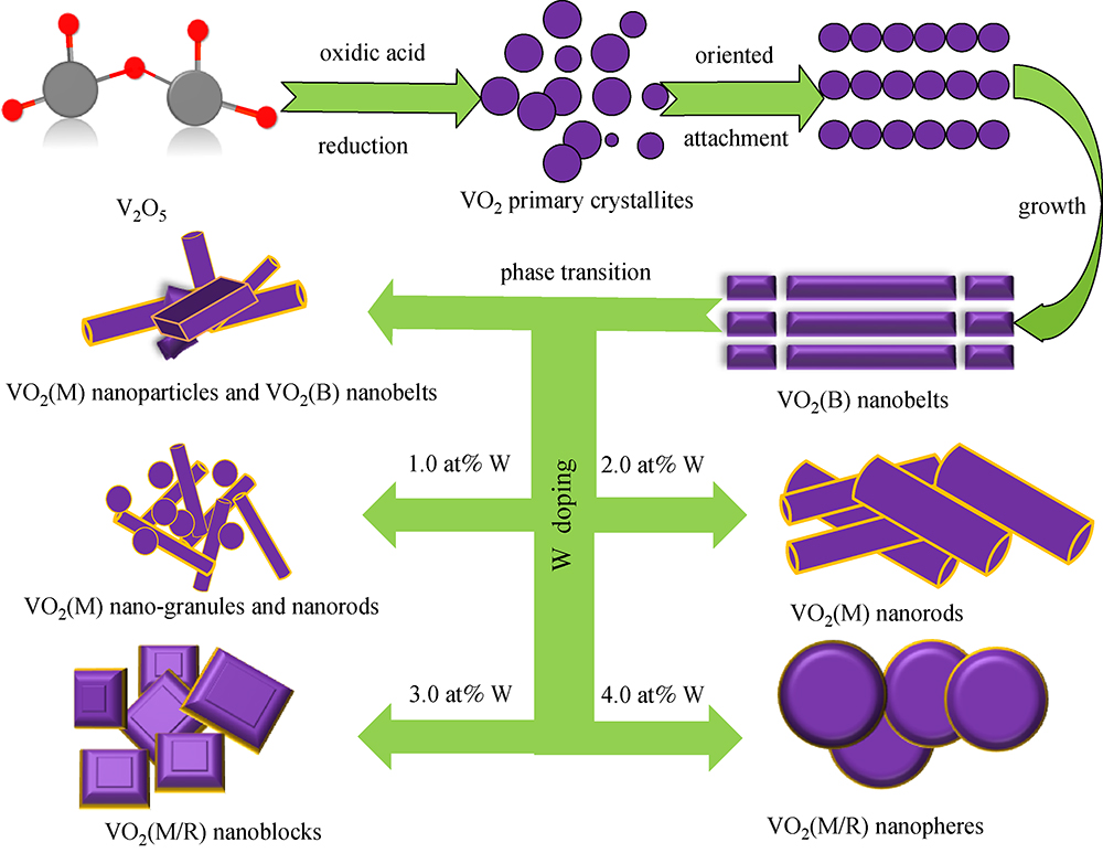 In this study, we developed a facile one-step hydrothermal process that allows to synthesize high-purity VO2(M/R) nanoparticles with various morphologies such as nanorods, nanogranules, nanoblocks, and nanospheres. W dopants are successfully implanted in VO2(M/R) unit cells with high doping efficiency, which allows to regulate the size, morphology, and phase of obtained nanoparticles. The underlying regulation mechanism is presented in detail to reveal how hydrothermal products vary with W doping contents, which provides a synthetic strategy for the preparation of shape-controlling VO2(M/R) nanoparticles with high purity to satisfy different specific demands for corresponding applications in the field of thermochromic smart windows.