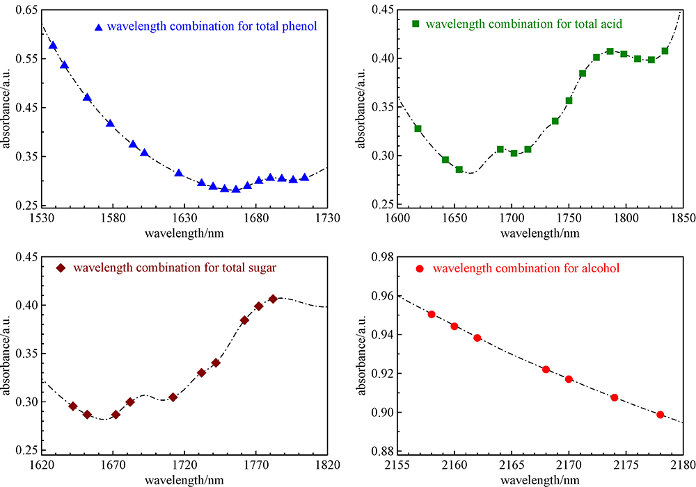 Alcohol, total sugar, total acid, and total phenol contents are the main indicators of wine quality detection. This study aims to establish simultaneous analysis models for the four indicators through near-infrared (NIR) spectroscopy with wavelength optimization. A Norris derivative filter (NDF) platform with multiparameter optimization was established for spectral pretreatment. The optimal parameters (i.e., derivative order, number of smoothing points, and number of differential gaps) were (2, 9, 3) for alcohol, (1, 19, 5) for total sugar, (1, 17, 11) for total acid, and (1, 1, 1) for total phenol. The equidistant combination-partial least squares (EC-PLS) was used for large-scale wavelength screening. The wavelength step-by-step phase-out PLS (WSP-PLS) and exhaustive methods were used for secondary optimization. The final optimization models for the four indicators included 7, 10, 15, and 13 wavelengths located in the overtone or combination regions, respectively. In an independent validation, the root mean square errors, correlation coefficient for prediction (i.e., SEP and RP), and ratio of performance-to-deviation (RPD) were 0.41 v/v, 0.947, and 3.2 for alcohol; 1.48 g/L, 0.992, and 6.8 for total sugar; 0.68 g/L, 0.981, and 5.1 for total acid; and 0.181 g/L, 0.948, and 2.9 for total phenol. The results indicate high correlation, low error, and good overall prediction performance. Consequently, the established reagent-free NIR analytical models are important in the rapid and real-time quality detection of the wine fermentation process and finished products. The proposed wavelength models provide a valuable reference for designing small dedicated instruments.